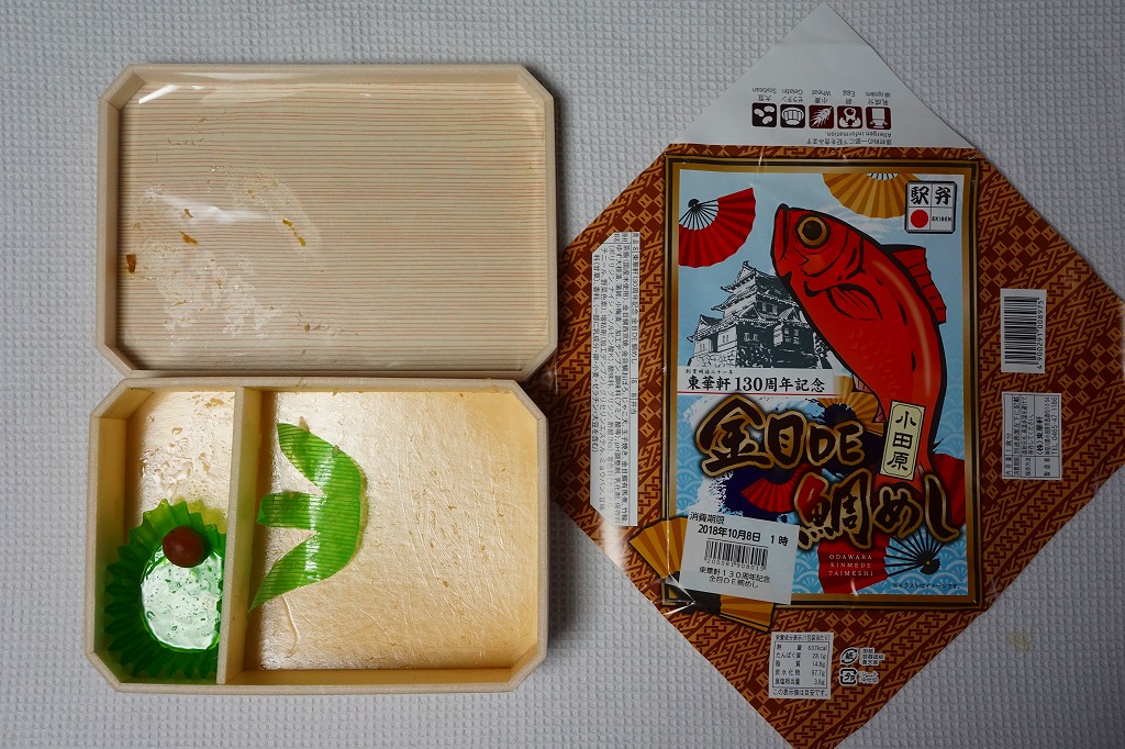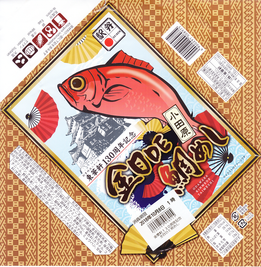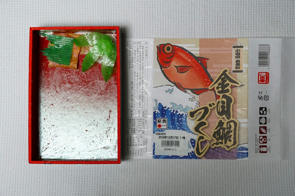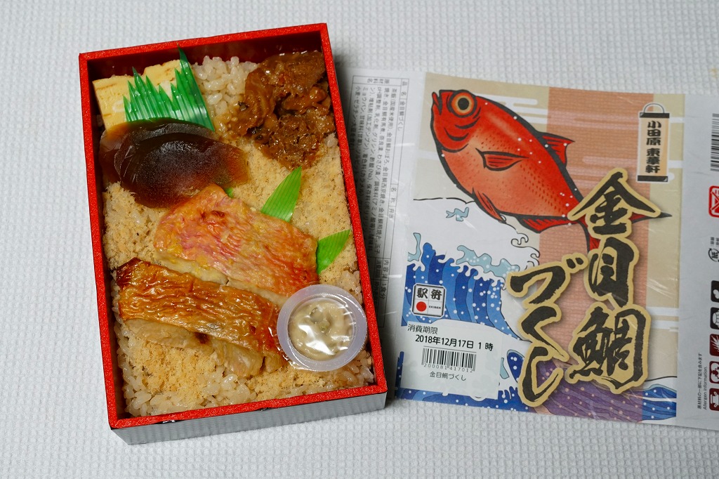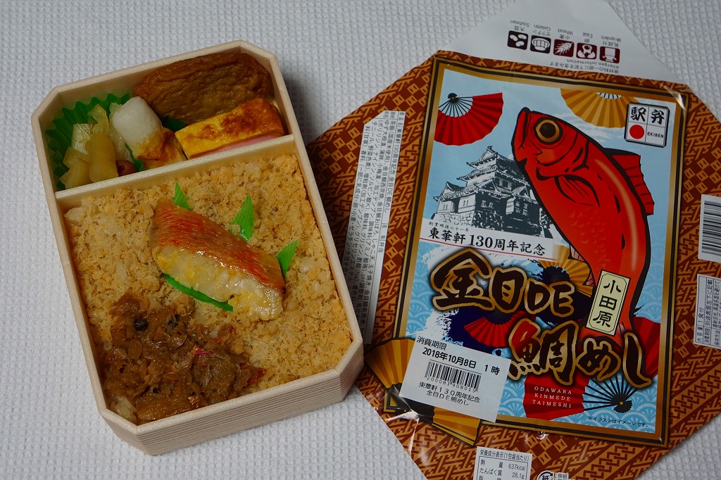 2018(平成30)年10月1日の発売か。掛紙に調製元の130周年記念とあり、同日にJR東日本の駅弁キャンペーン「駅弁味の陣2018」にエントリー。中身は現在の小田原駅で伝統の駅弁「鯛めし」にキンメダイを取り入れたようなもの。茶飯をキンメダイのおぼろで覆い、キンメダイの西京焼と有馬煮を載せ、じゃこ天、玉子焼、ちくわ、かまぼこ、小梅、ゆず大根漬を添える。