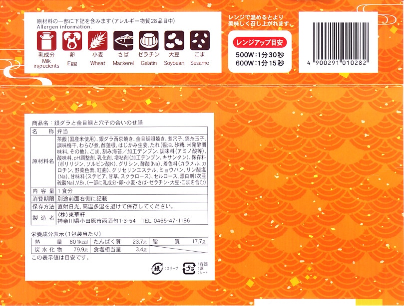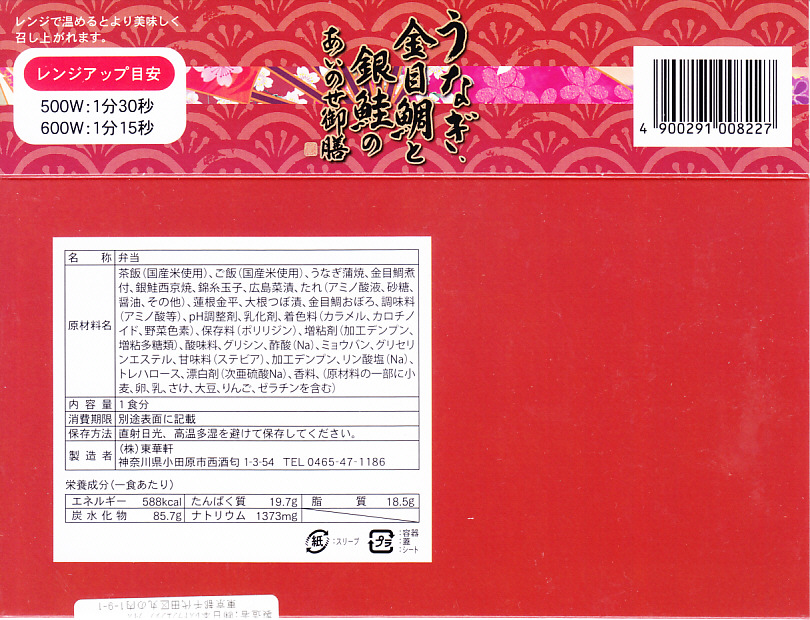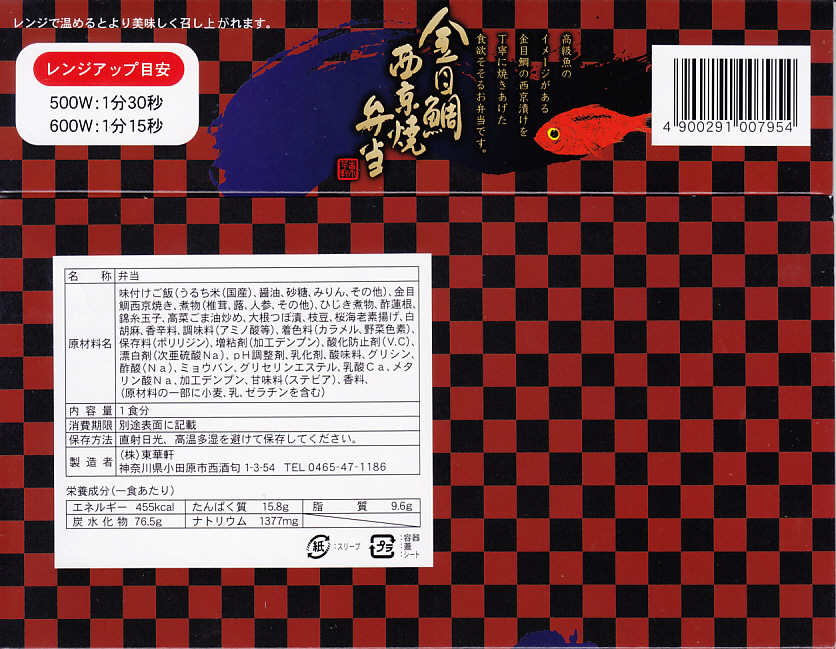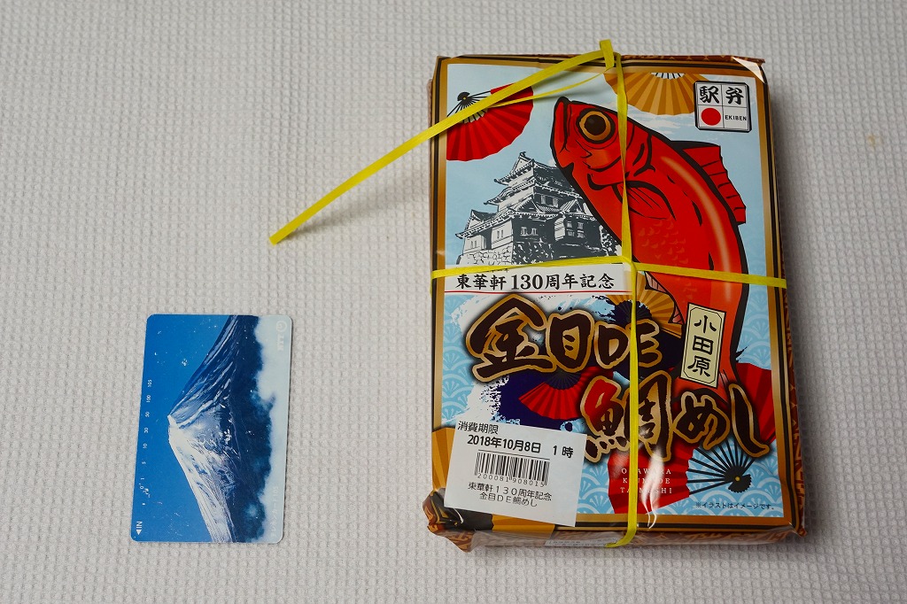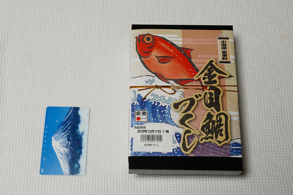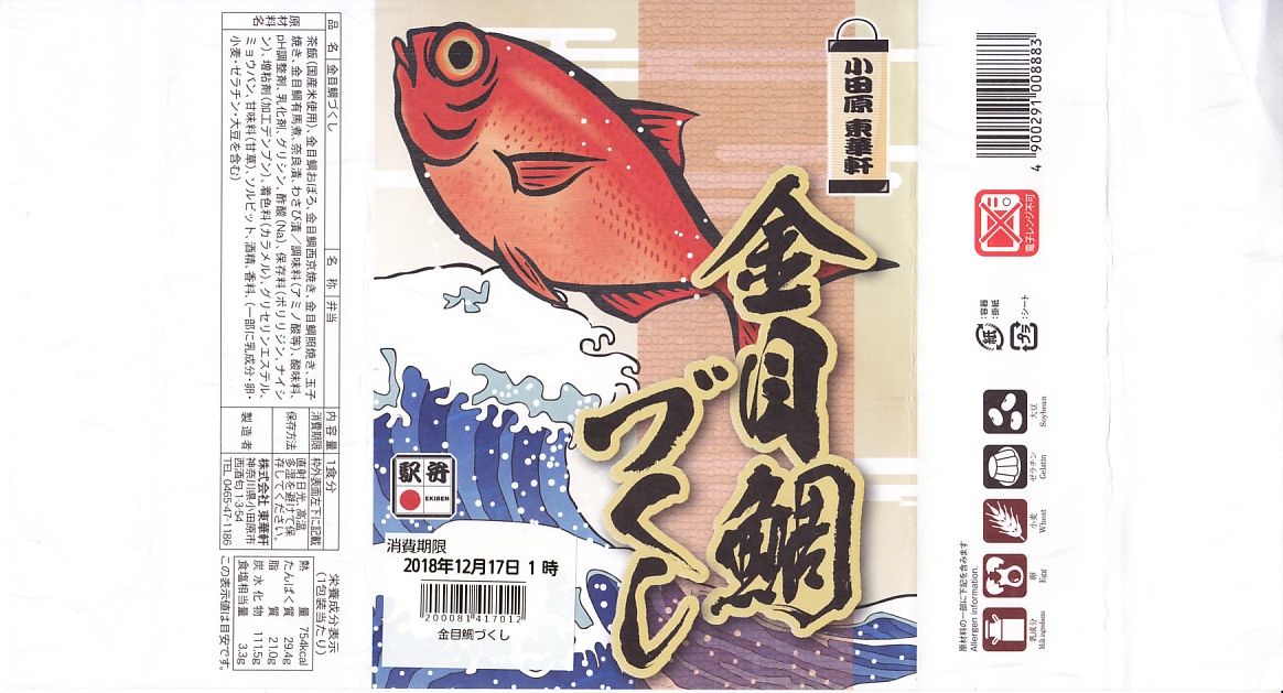 2018(平成30)年10月1日の発売か。掛紙に調製元の130周年記念とあり、同日にJR東日本の駅弁キャンペーン「駅弁味の陣2018」にエントリー。中身は現在の小田原駅で伝統の駅弁「鯛めし」にキンメダイを取り入れたようなもの。茶飯をキンメダイのおぼろで覆い、キンメダイの西京焼と有馬煮を載せ、じゃこ天、玉子焼、ちくわ、かまぼこ、小梅、ゆず大根漬を添える。