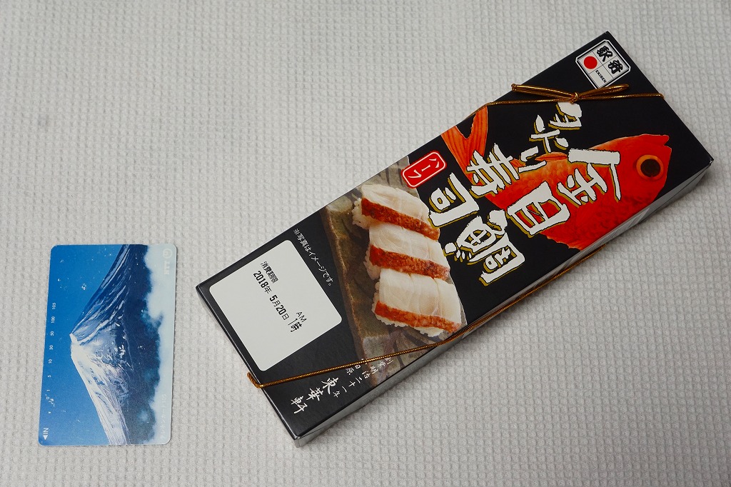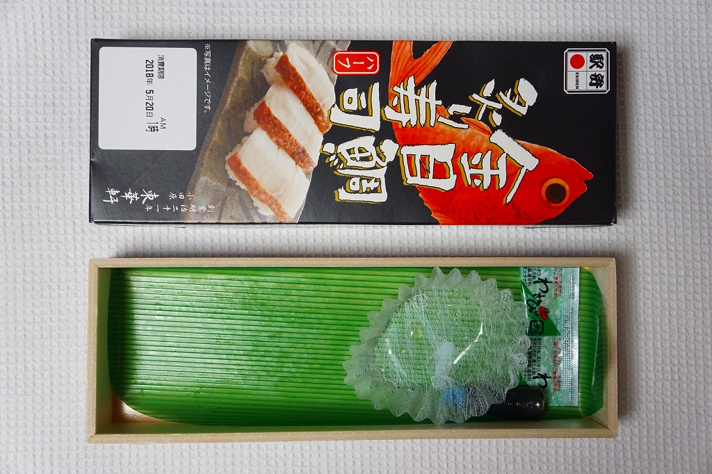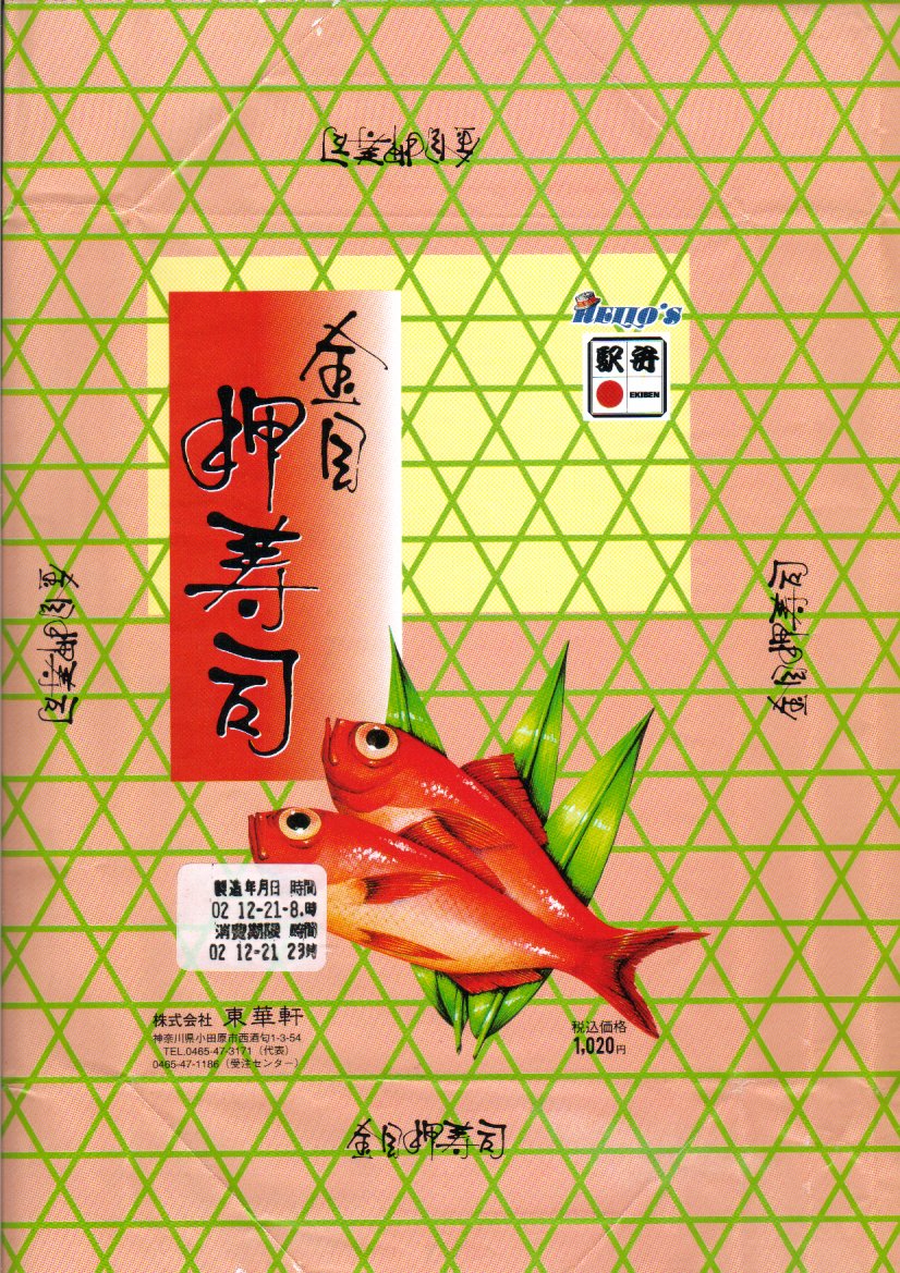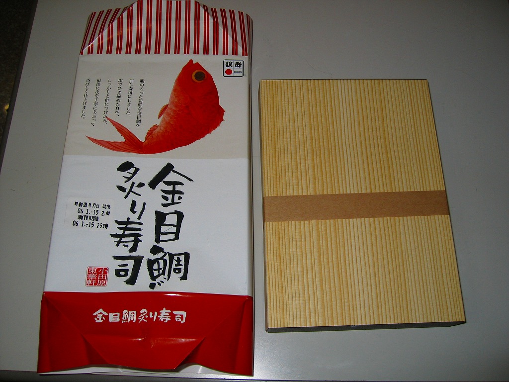 2005(平成17)年の発売。容器や中身は3年前に買った下記の、おそらく前作であろう「金目押寿司」と同じだが、金目鯛の表面は軽くあぶられており、掛紙のデザインを一新し商品名も変えて、ついでに価格も30円アップ。風味も含めて全体的にぐっと現代風になった感じ。価格は2006年の発売時や購入時で1,050円、2015年時点で1,250円。2022年1月に終売。