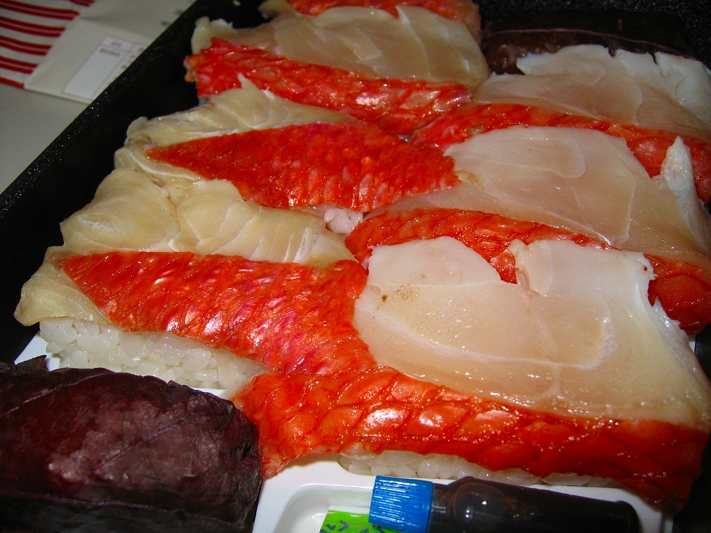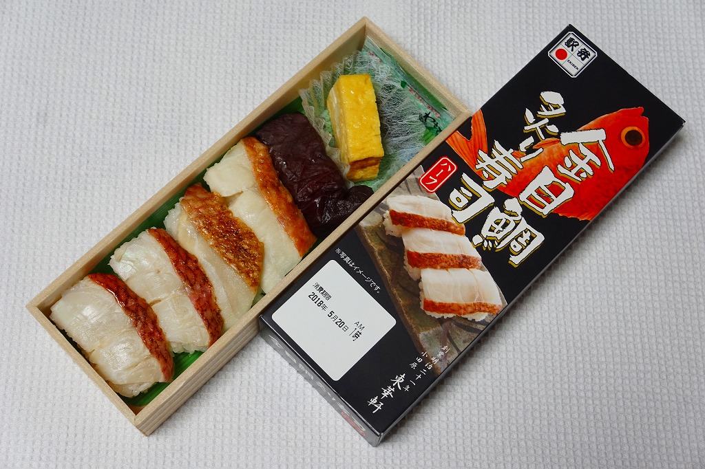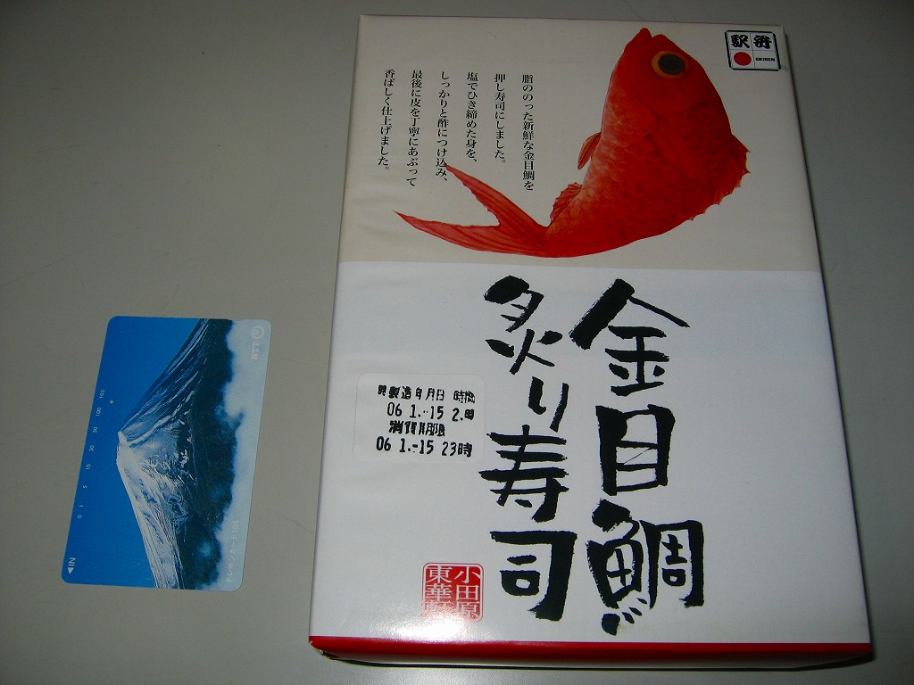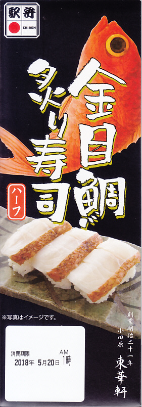 小田原駅弁で名物である小鯵押寿司の、金目鯛バージョン。金目鯛色の包装紙に容器が包まれる。紙のふたを開くとトレーの上に金目鯛の押寿司が7個、しその葉を巻いた寿司がひとつ、みょうがを載せた寿司がひとつ入る。ふんわり甘い食感が、やはり上品だ。上記の駅弁「金目鯛炙り寿司」が発売された2005年までには終売となった模様。