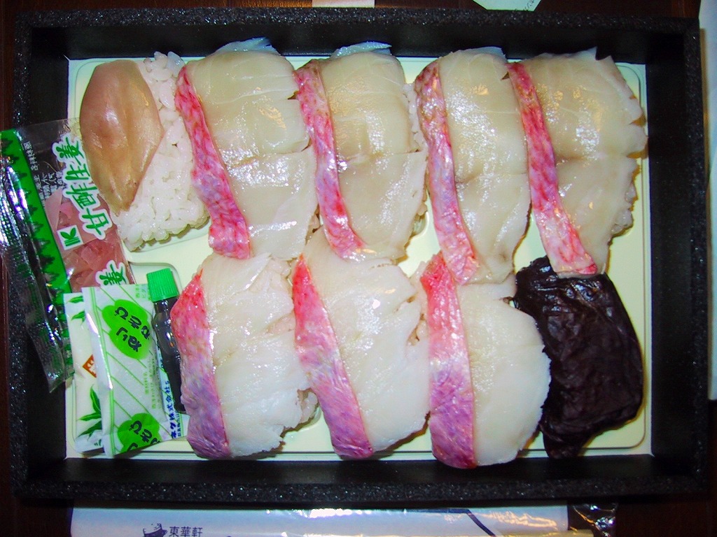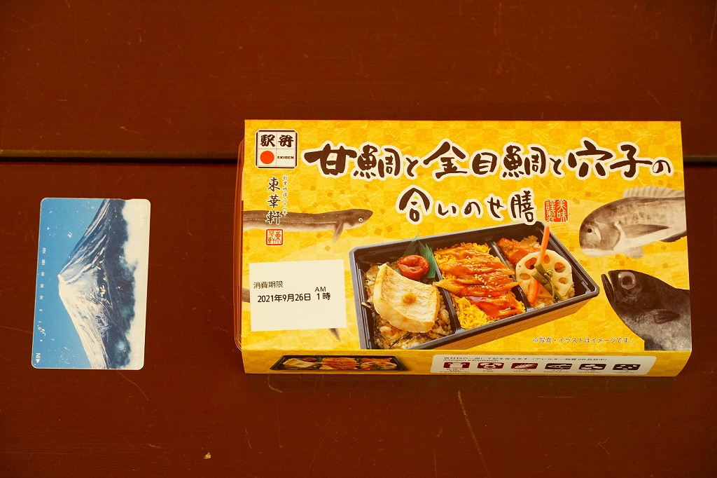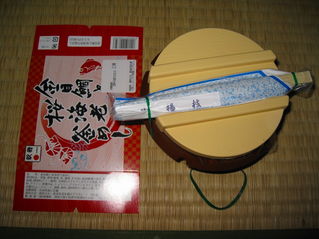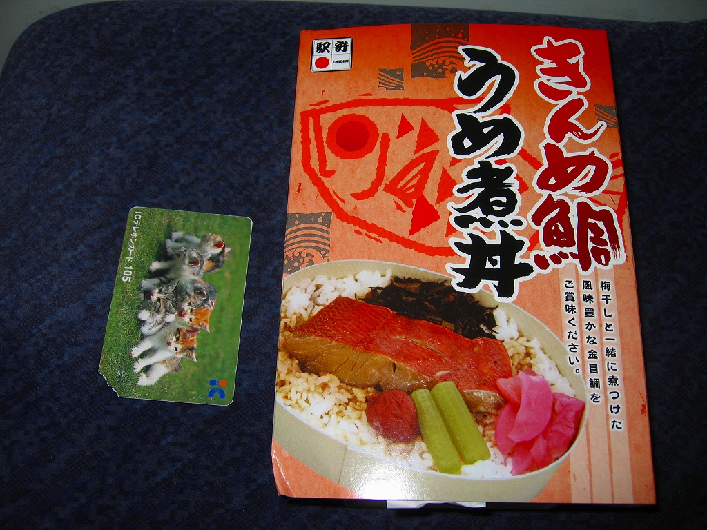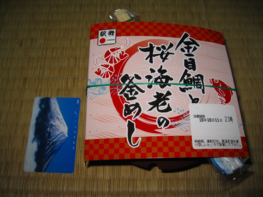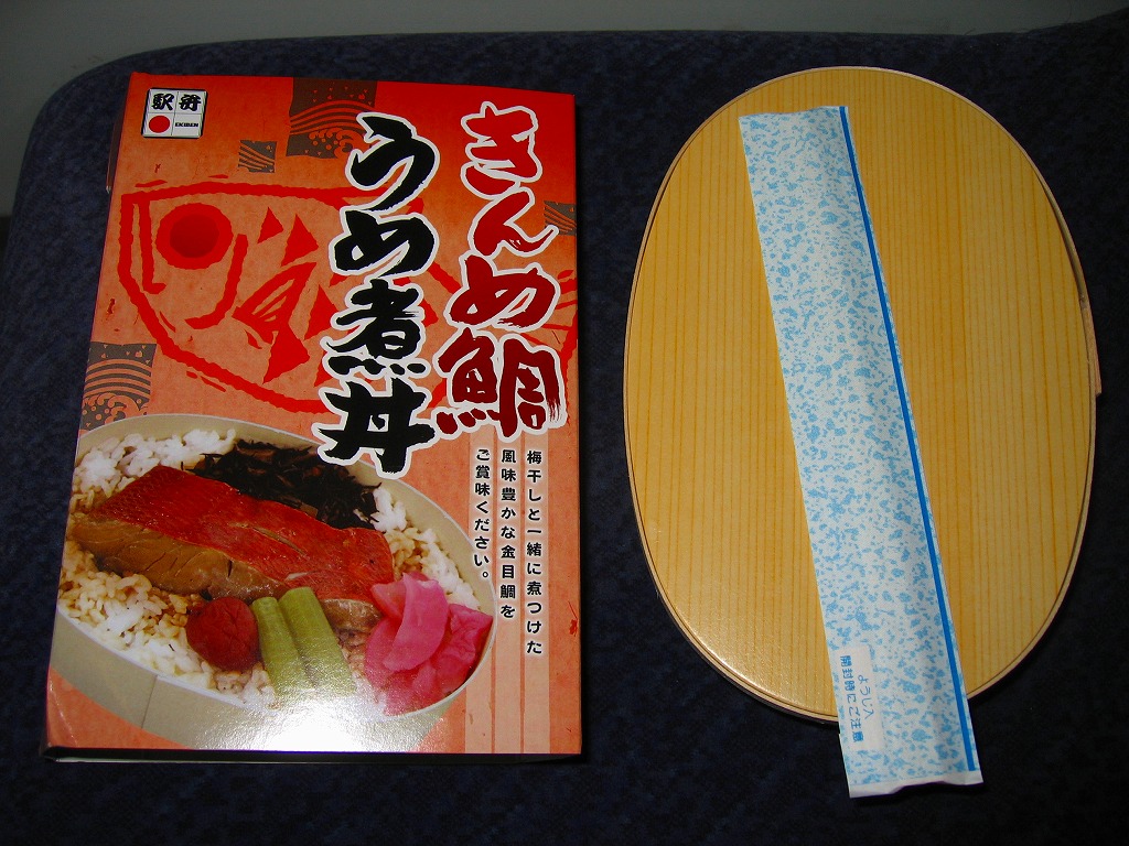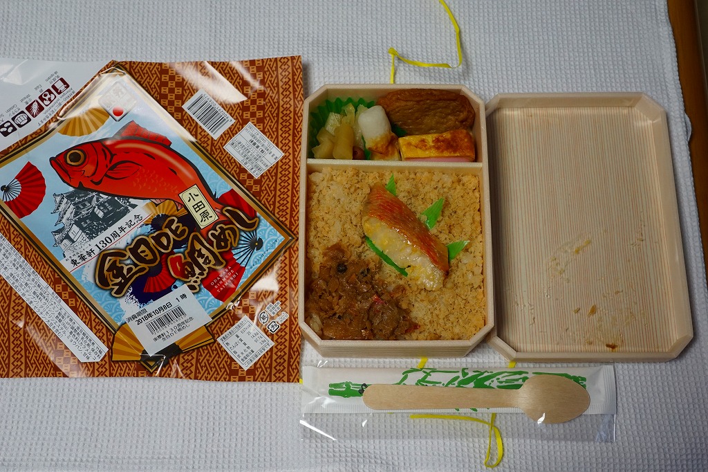 金目鯛は梅干と煮たそうだが、普通の煮付けと変わらない味。味はともかく雰囲気にやっつけ感のある家庭料理だが、キンメダイの駅弁など小田原と伊豆急下田にしかないし、寿司ではなく煮付けは初めてだと思うので、今後の競争やリニューアルで洗練されていくことが期待できる。2009年までの販売か。