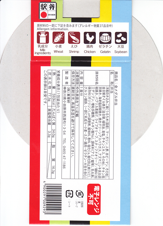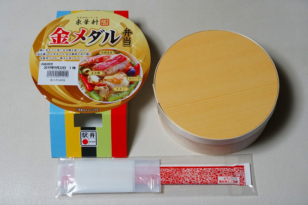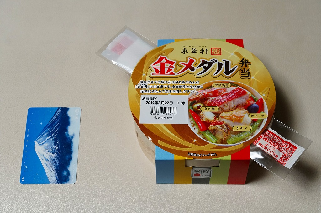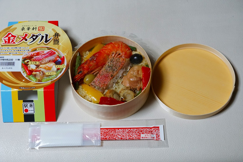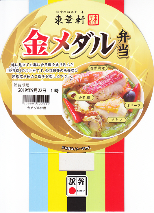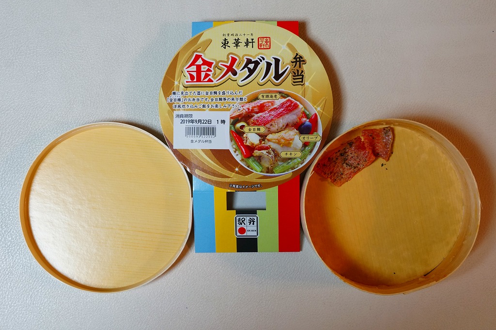小田原駅弁「こゆるぎ茶めし」と同じ構造を持つ容器の中身は、カレー風味の洋風炊き込みご飯を、キンメダイのパセリバターオイル焼き、有頭海老、チキン、オリーブなどで覆うもの。洋風キンメダイ丼という、駅弁として、そしておそらく市販の弁当としても、類例のない創作だと思う。中身の写真を掲載するスリーブに、「樽に見立てた器に金目鯛を盛り込んだ「金目樽(キンメダル)」のお弁当です。」という解説を記したり、商品名のうち「金メ」を赤文字で記す、キンメダイが主役の駅弁。2021年8月限りで終売。