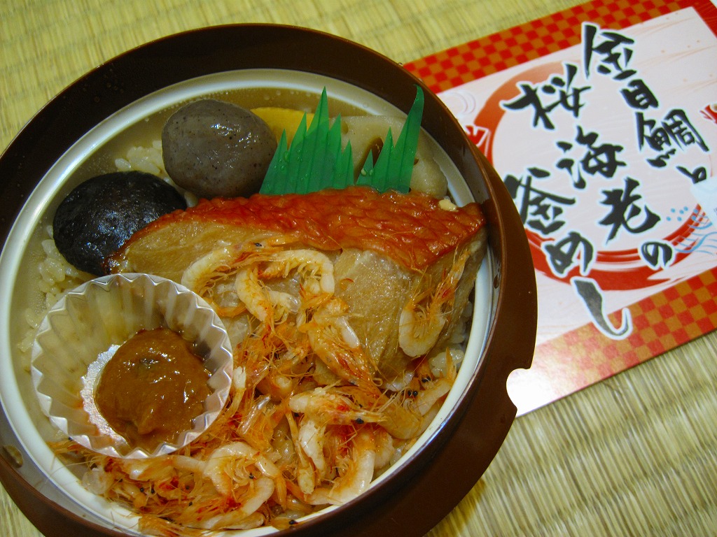 2010(平成22)年10月9日から11日まで東京駅で開催された「第12回東日本縦断駅弁大会」までに用意された新作。総プラスティック製の釜型容器を使用、商品名とキンメダイやエビを描いたボール紙製の赤い掛紙をかける。中身は茶飯の上にキンメダイの漬け焼きとサクラエビの炒り煮を置き、玉こんにゃく、シイタケ煮、タケノコ、レンコンを添え、わさび味噌を付けるもの。