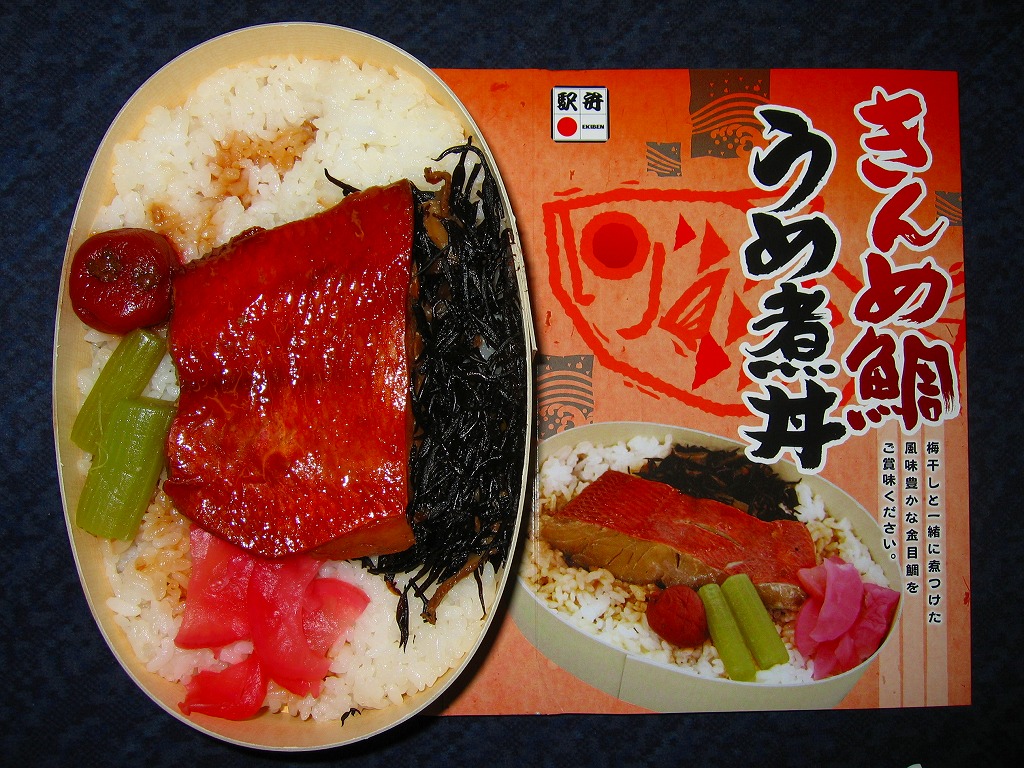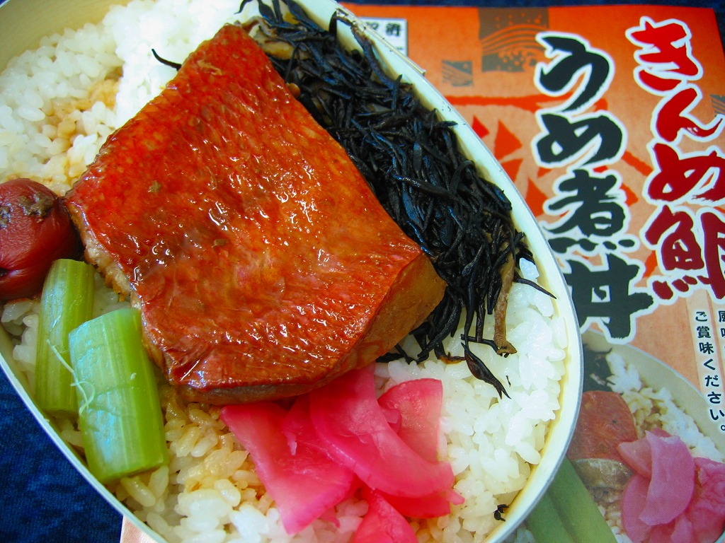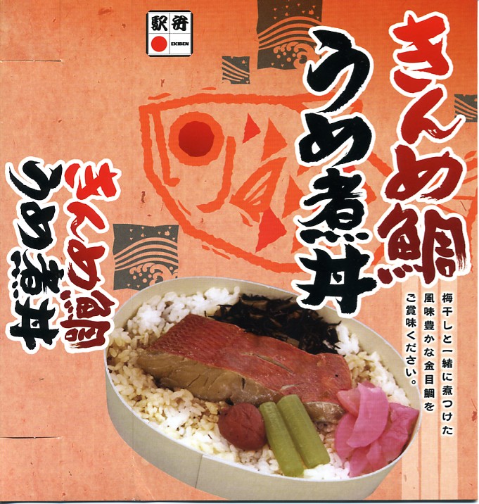2008(平成20)年7月に発売。ボール紙製の楕円形の容器を、商品名や中身写真を描いたボール紙の枠にはめる。中身は白御飯の上にキンメダイの煮付けをどーんと置き、ひじきと大根漬と梅干とフキを添えるもの。