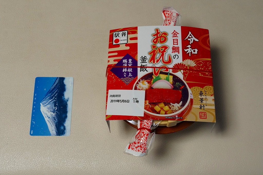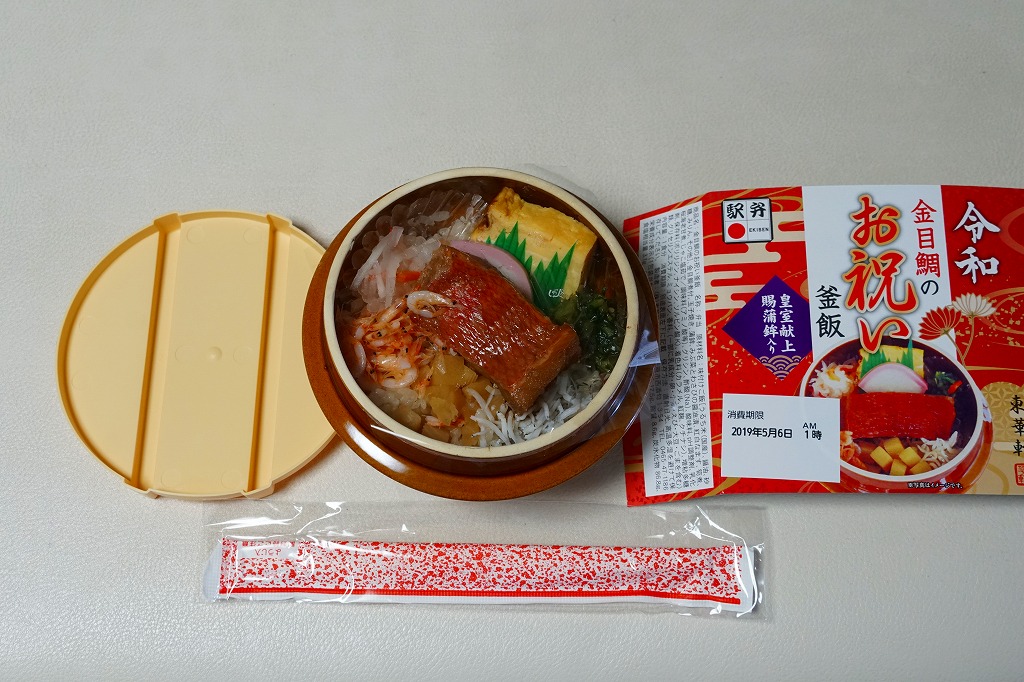 2018(平成30)年10月の新作か。浅い容器に茶飯を敷き、キンメダイのおぼろで覆い、キンメダイの照焼と西京焼と有馬煮、玉子焼と奈良漬とわさび漬を載せる。同時期に発売の下記「金目DE鯛めし」など、これによく似た駅弁を小田原や東京でよく見ている気がするが、駅弁として安定感のある内容ではないかと。値段はずいぶん高くなった。半年間ほどの販売か。