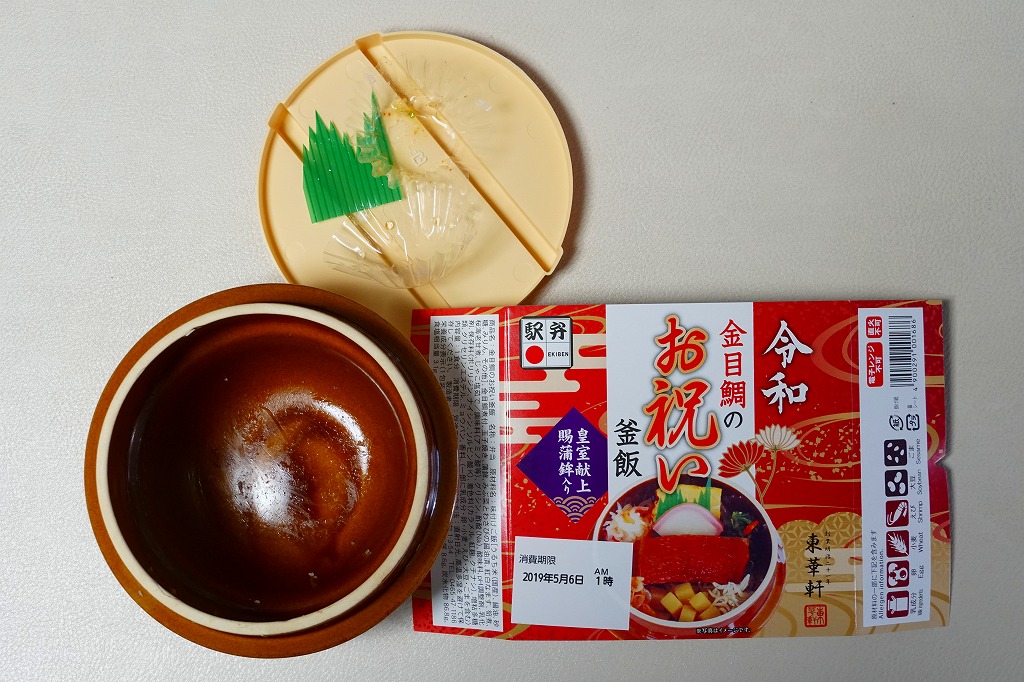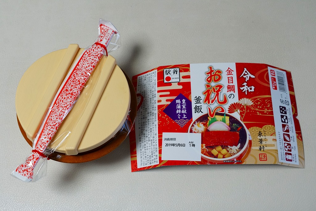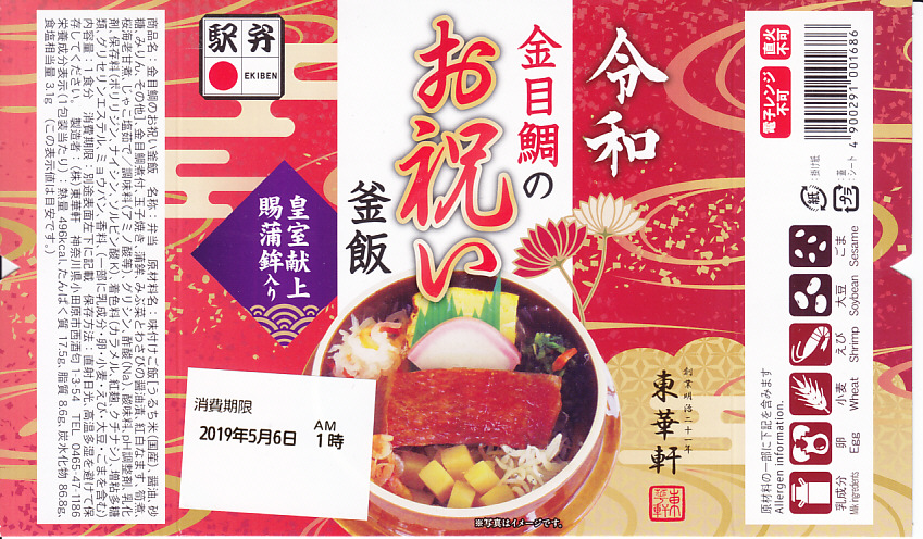 2019(平成31・令和元)年のゴールデンウィークに小田原駅や東京都内で販売。改元記念駅弁の小田原駅版。その後にスーパーの駅弁催事で売られた形跡はある。本体は陶製、ふたはプラ製の釜飯型容器に、令和の文字と華やかな絵柄と中身の写真を載せたボール紙を載せていた。中身は茶飯をじゃこ、サクラエビ、タケノコ、なます、みぶ菜、玉子焼で覆い、キンメダイの煮付けを置いたもの。外観も中身も赤みがかった記念駅弁。