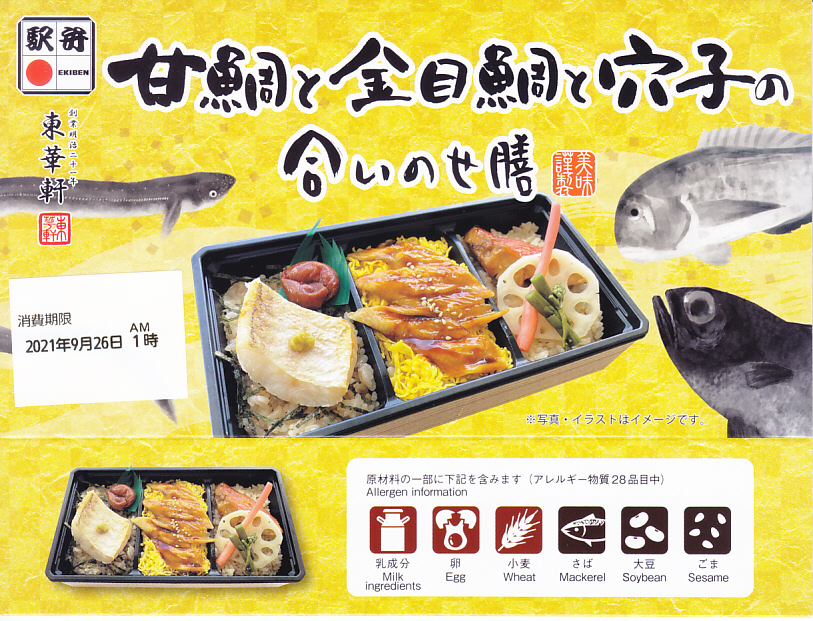 2021(令和3)年10月5日に購入した、小田原駅弁のスリーブ。上記の駅弁「甘鯛と金目鯛と穴子の合いのせ膳」の購入10日後で、中身などは何も変わらない。JR東日本の駅弁キャンペーン「駅弁味の陣2021」へのエントリーに伴い、それを示すシールを貼り付けたため、タイのイラストが隠れてしまった。