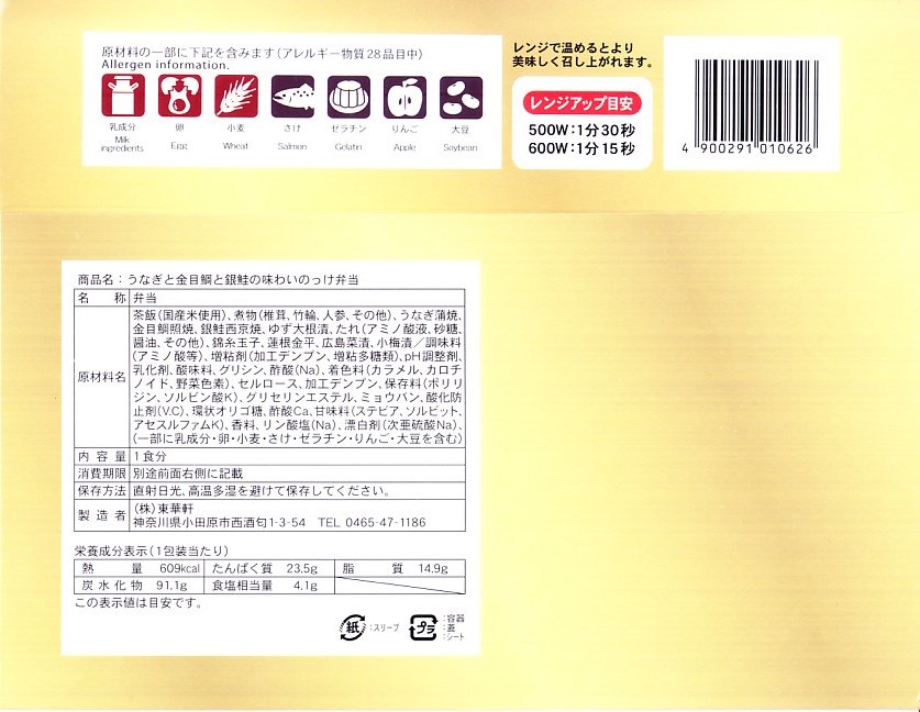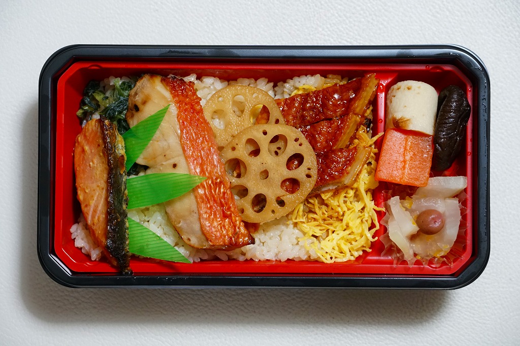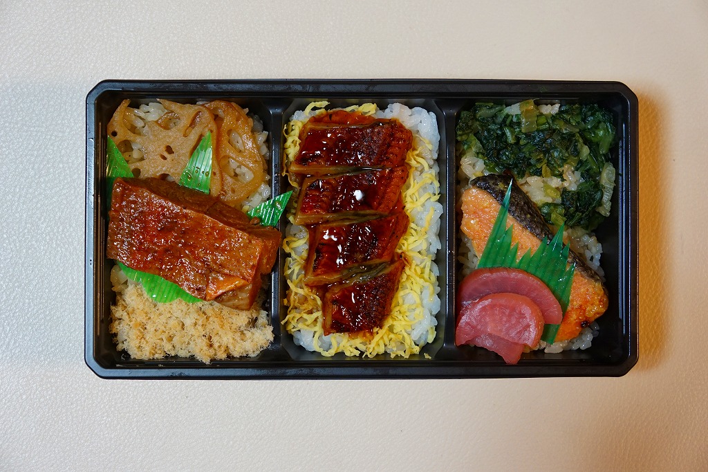 2024(令和6)年3月1日に小田原駅などで発売。スリーブでは「うなぎと金目鯛と銀鮭」が目立ち、レシートには「味わいのっけ弁当」と書いてあった。長方形のプラ容器に茶飯を詰め、うなぎと金目鯛と銀鮭を載せ、錦糸卵、れんこんのきんぴら、広島菜漬も載せ、しいたけやちくわなどの煮物と、ゆず大根と小梅の漬物を添える。「うなぎ、金目鯛、銀鮭、3種類のお魚を存分に味わって頂きたいです」と調製元がSNSで発信したとおり、しっかりした味付けでその3種をおかずに飯が食える。下記のとおりキンメダイを含めた3種の具をうたう小田原駅弁が乱発されており、その中には「うなぎ、金目鯛と銀鮭のあいのせ御膳」というものもあり、印象が重なる感じは受ける。価格は2024年の発売時で1,480円、2025年6月から1,580円。