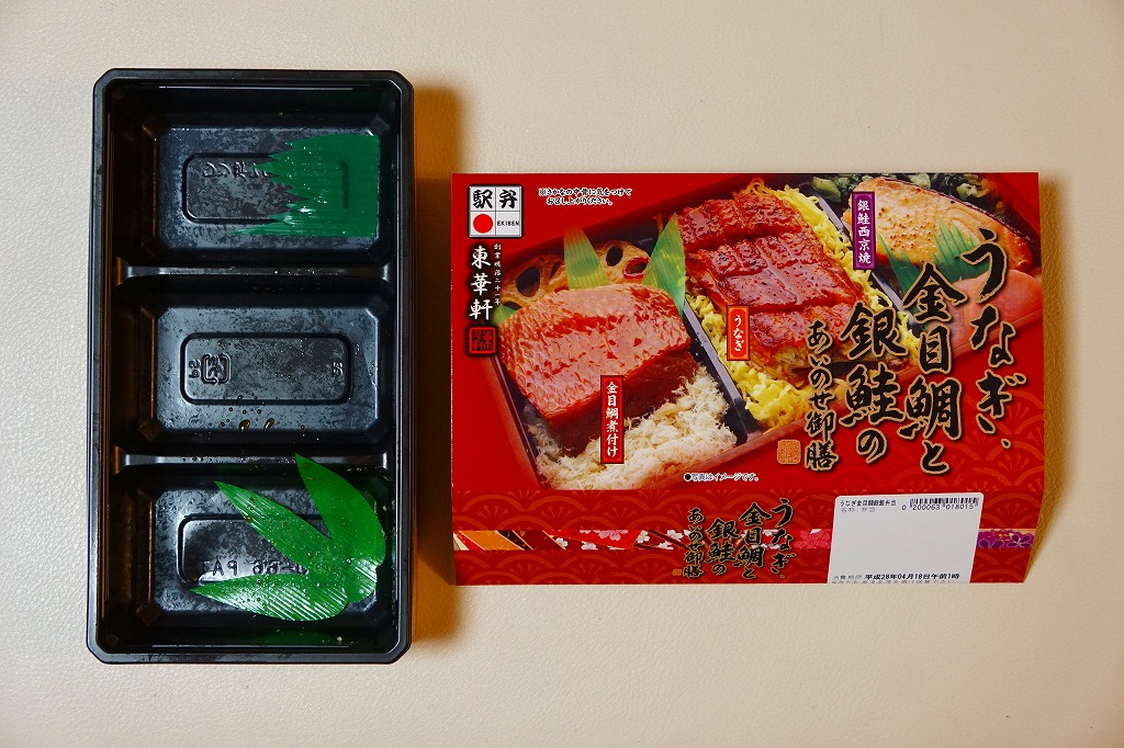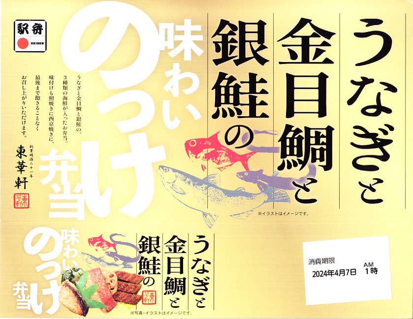 2016(平成28)年の1月か2月に発売。パッケージの写真のとおり、容器の3区画に銀鮭西京焼丼、うなぎ丼、キンメダイ煮付け丼を並べる。このとおり御飯だらけ、御飯物だけの駅弁であるが、そんなに大量でなく、いろんな魚を味わえるという点で希少な個性を備える。発売時点で小田急時刻表に単独広告を出すなど、調製元一押しの駅弁。なお、今回は東京駅の駅弁売店での実演販売で購入したため、食品表示ラベル上の製造者が東華軒でなく日本レストランエンタプライズになっている。価格は2016年の購入時で1,100円、2022年6月16日から1,230円。2023年8月限りで終売の予定。