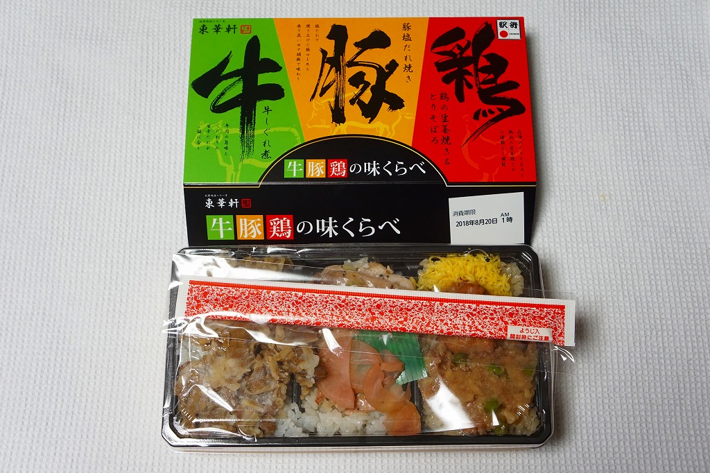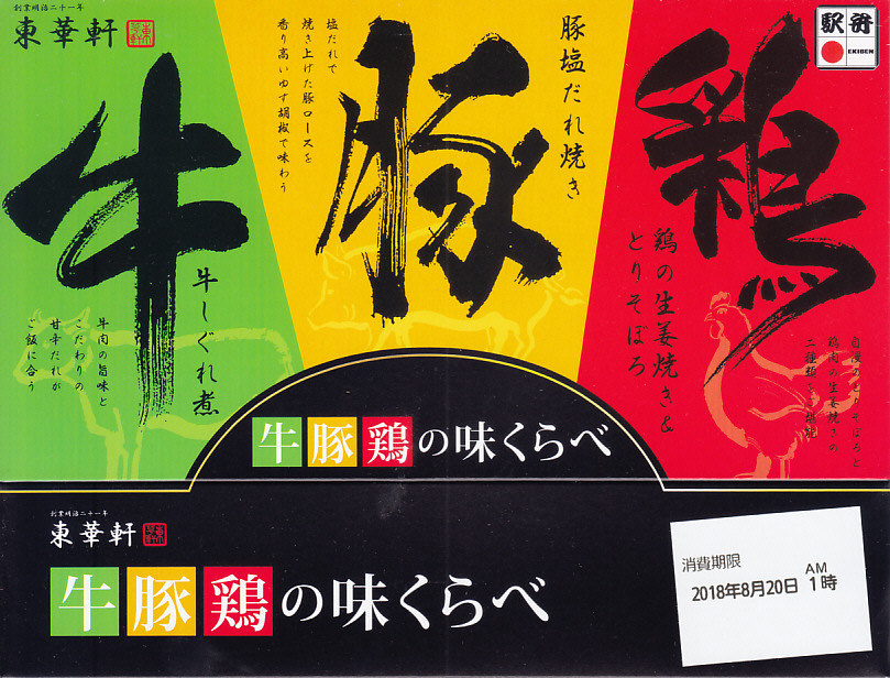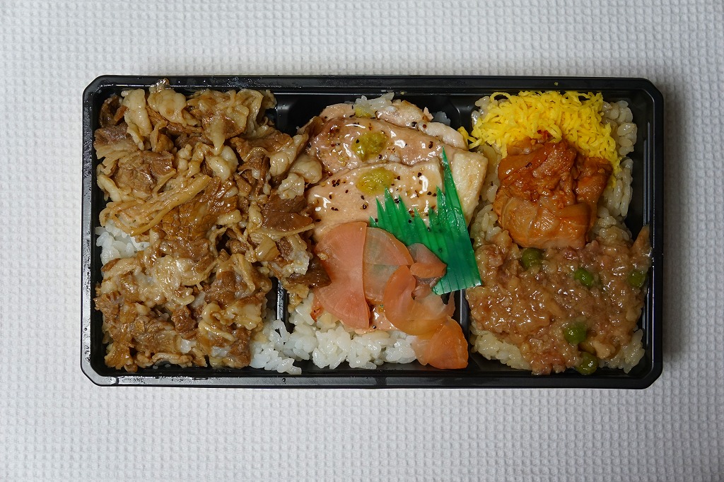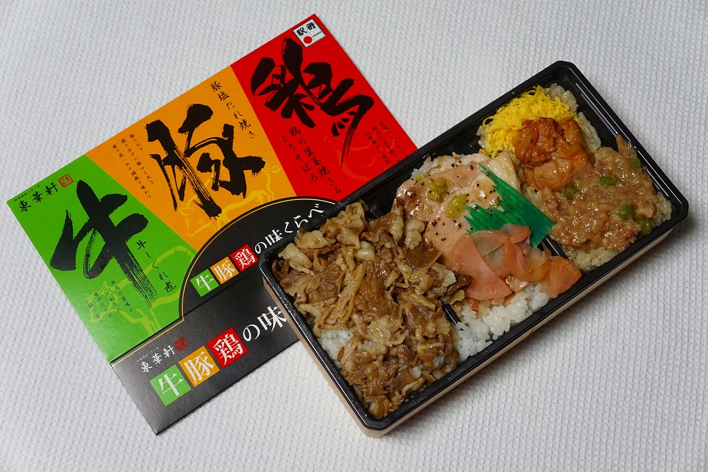 2018(平成30)年6月に発売。駅弁の名前のとおりの、牛丼と豚丼と鶏丼の詰合せ。長方形の容器に仕込まれた3つのくぼみのすべてに白飯を詰め、牛しぐれ煮、豚塩だれ焼きと大根漬、鶏の生姜焼きととりそぼろと錦糸卵で覆う。見栄えはそれほどでもないが、味は上等。そういえば山形駅の駅弁に同じようなものがあった。2022年5月限りで終売。