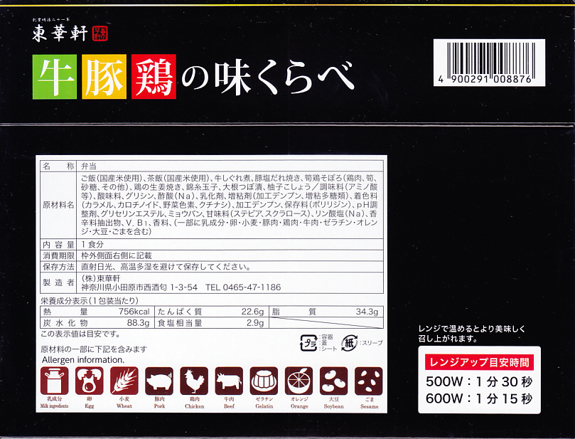 パッケージのデザインは催事の臭いが強く感じられ、円形の容器は簡素が過ぎてボール紙がほぐれてしまっていた。茶色く染まる内容も、油が利いた強めの味付けも、ホカ弁やコンビニ弁当に親しむ方々に向けた駅弁であると思う。なお、2010年3月27日に熱海駅でも同じものを買えた。2012年中に終売か。