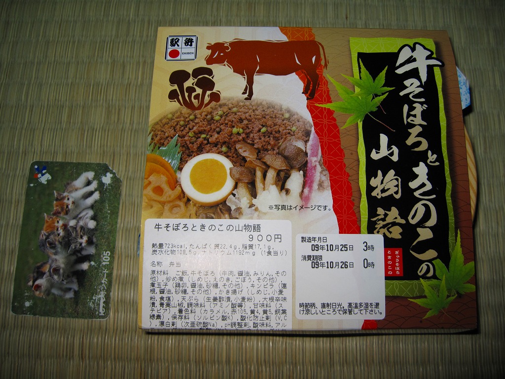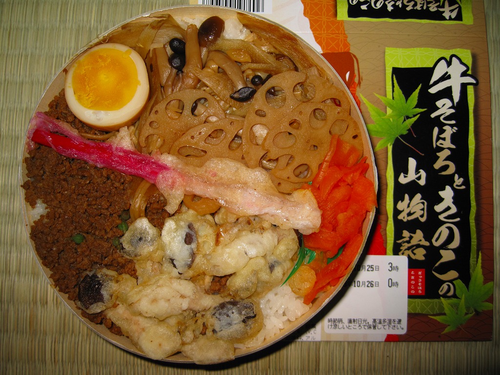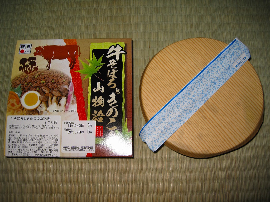2009(平成21)年6月に発売か。ボール紙でできた木目柄の円形の容器を、駅弁の名前や中身の写真を印刷したボール紙の枠にはめる。中身は白御飯の上を牛そぼろ、シメジやエノキなどの炒め煮、シメジのかき揚げ、レンコン煮などで覆い、はじかみと煮卵と大根辛味漬を添えるもの。