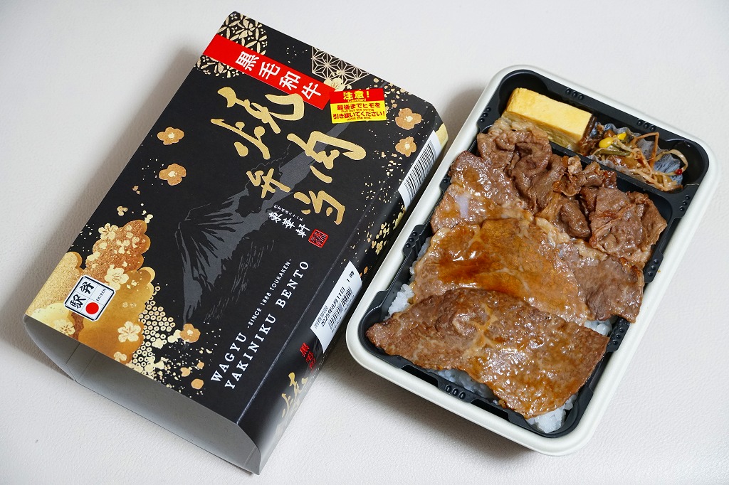 2025(令和7)年3月22日に小田原駅などで発売。四角く黒い加熱機能付き容器を、金色で商品名や富士山を囲む絵柄などを記した黒いスリーブに収める。中身は白飯を黒毛和牛の焼肉で覆い、山菜ビビンバと玉子焼いを添えたもの。東京や各地で既視感のある、やや韓国風の焼肉弁当で、小田原や新作の駅弁には見えない感じも、薄く煮たり焼いた感じのタレ付きお肉は適度にうまかった。東京駅で買える牛焼肉の駅弁として、価格も風味も適度な高級感。
