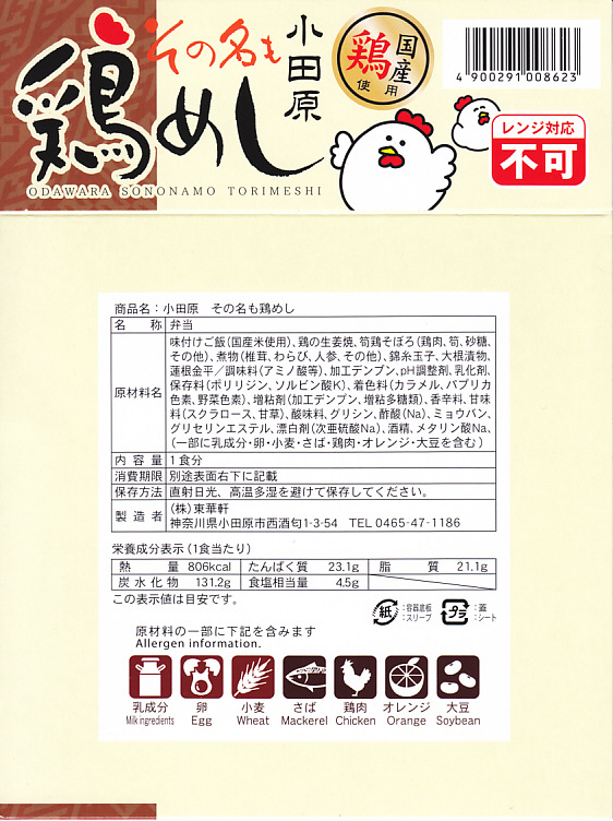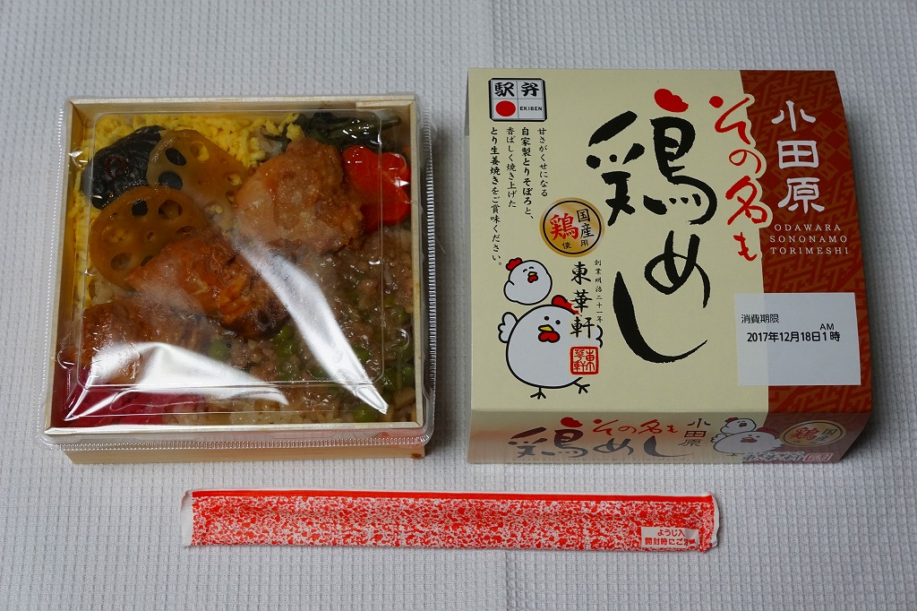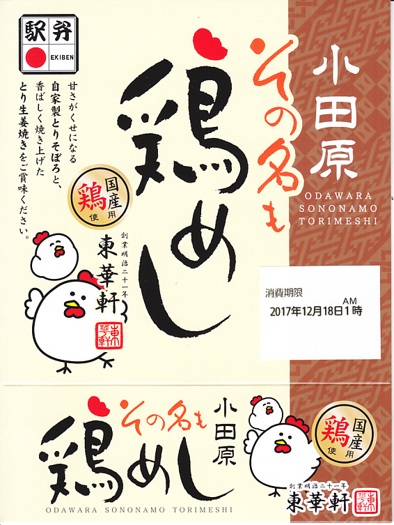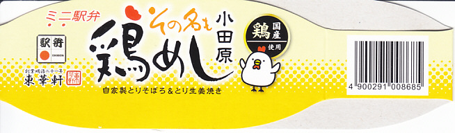 2017(平成29)年9月の発売か。従前の「その名も鶏丼」のリニューアルか。正方形の容器に茶飯を敷き、小田原駅弁名物のとりそぼろ、錦糸卵、鶏の生姜焼で覆い、シイタケ、レンコン、ニンジン、ワラビ、大根漬物を添える。小田原駅弁の東華軒らしい味。価格は2017年の発売時や購入時で890円、2022年1月15日から950円。2023年8月限りで終売。