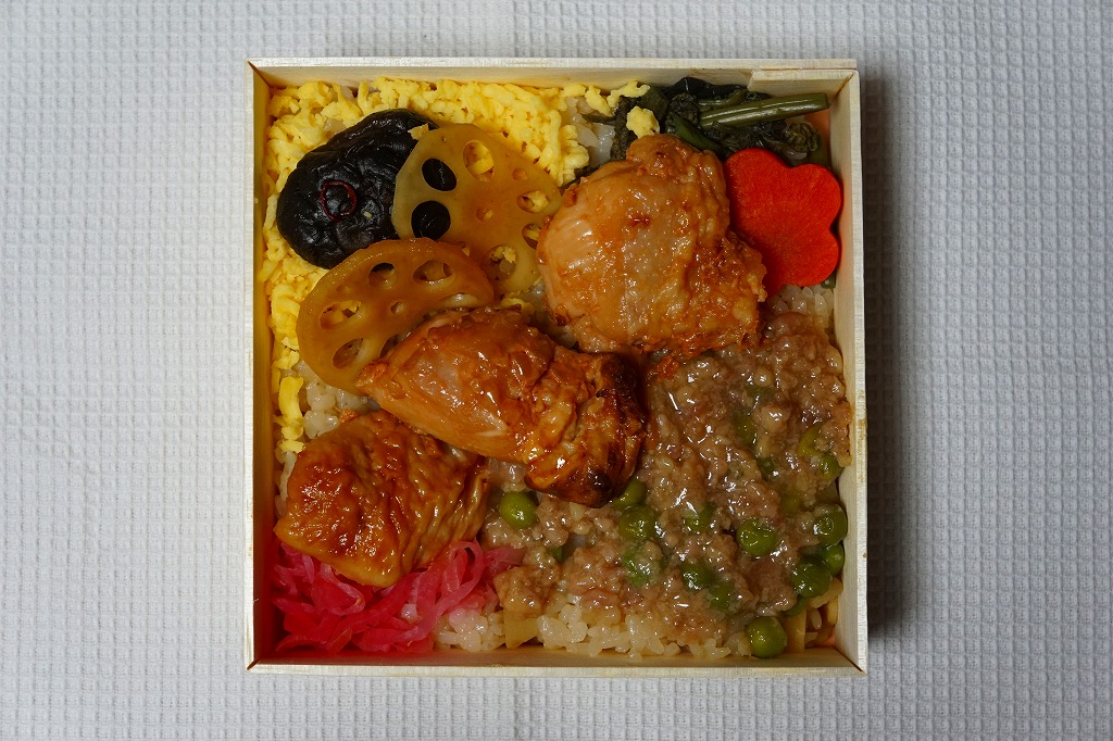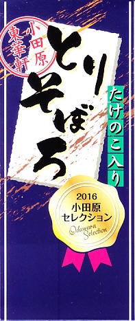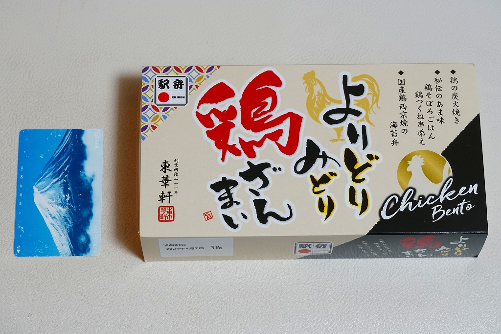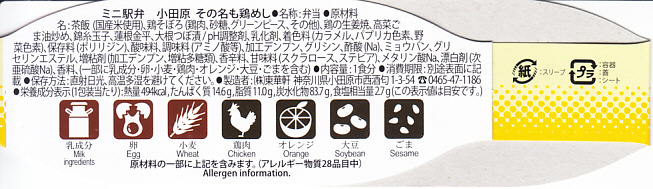 2024(令和6)年3月21日に小田原駅などで発売。長方形のプラ容器の3区画は、「鶏の炭火焼き」と茶飯と大根つぼ漬、「秘伝のあま味鶏そぼろごはん鶏つくね串添え」に炒り卵とにんじん、「国産鶏西京焼の海苔弁」に竹輪磯辺揚げ。鶏肉のミニ丼の詰合せ。鶏でくどそうな見た目に違い、味が立たずおとなしいので、黙々といただける。真ん中のとりそぼろで、小田原駅の駅弁だとわかる。価格は2024年時点で1,150円、2025年2月から1,200円。