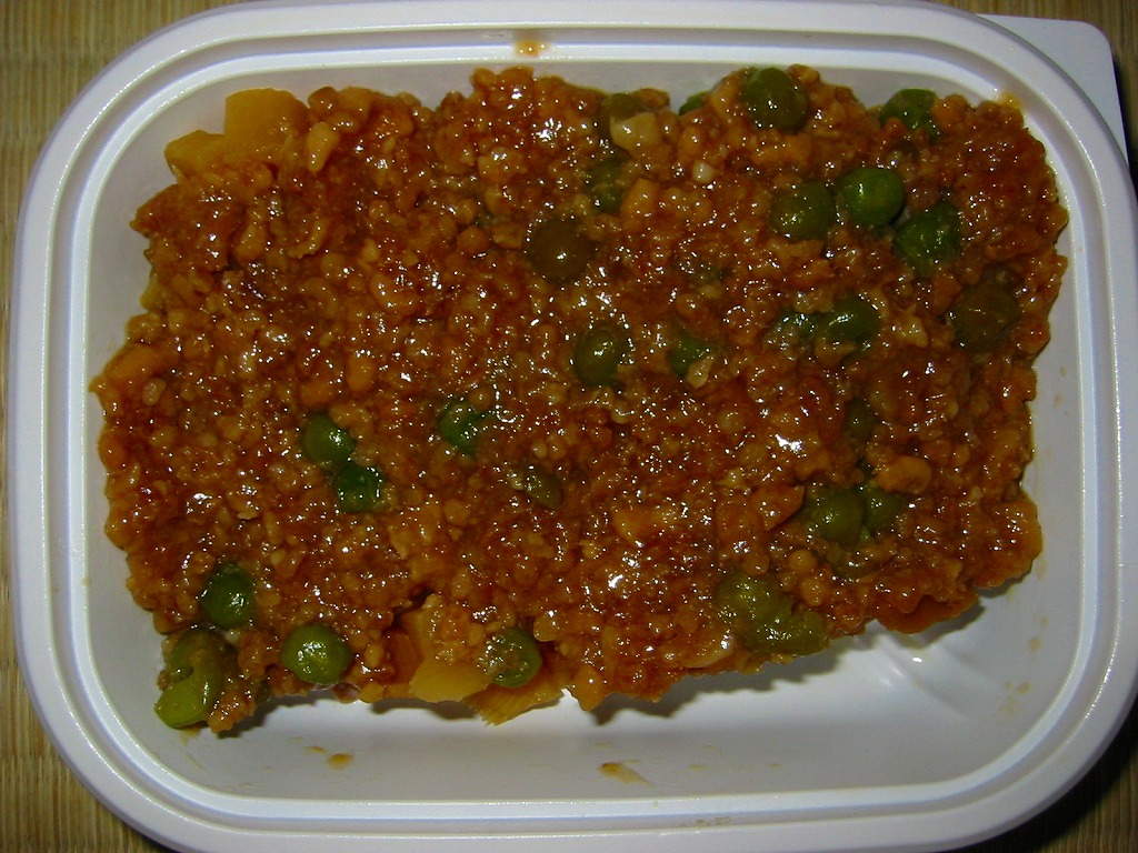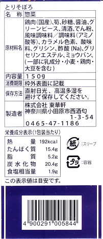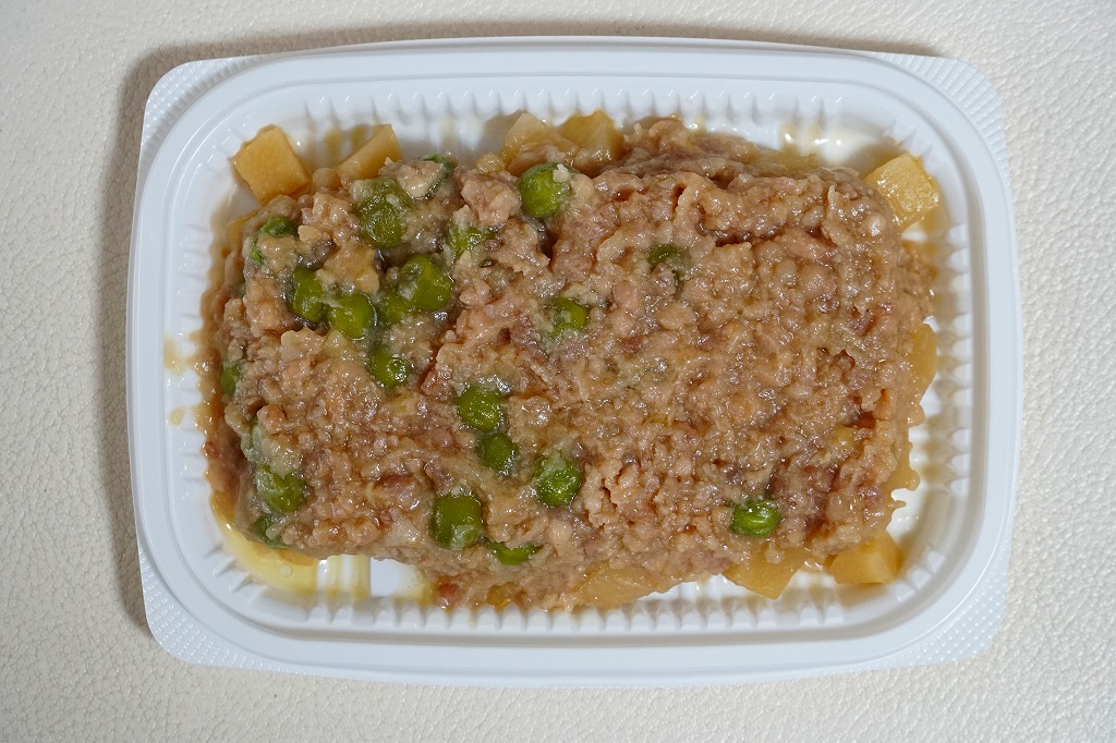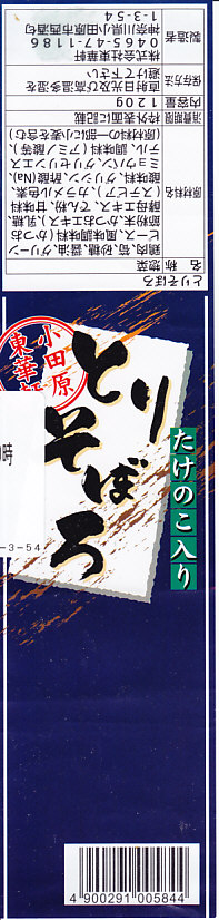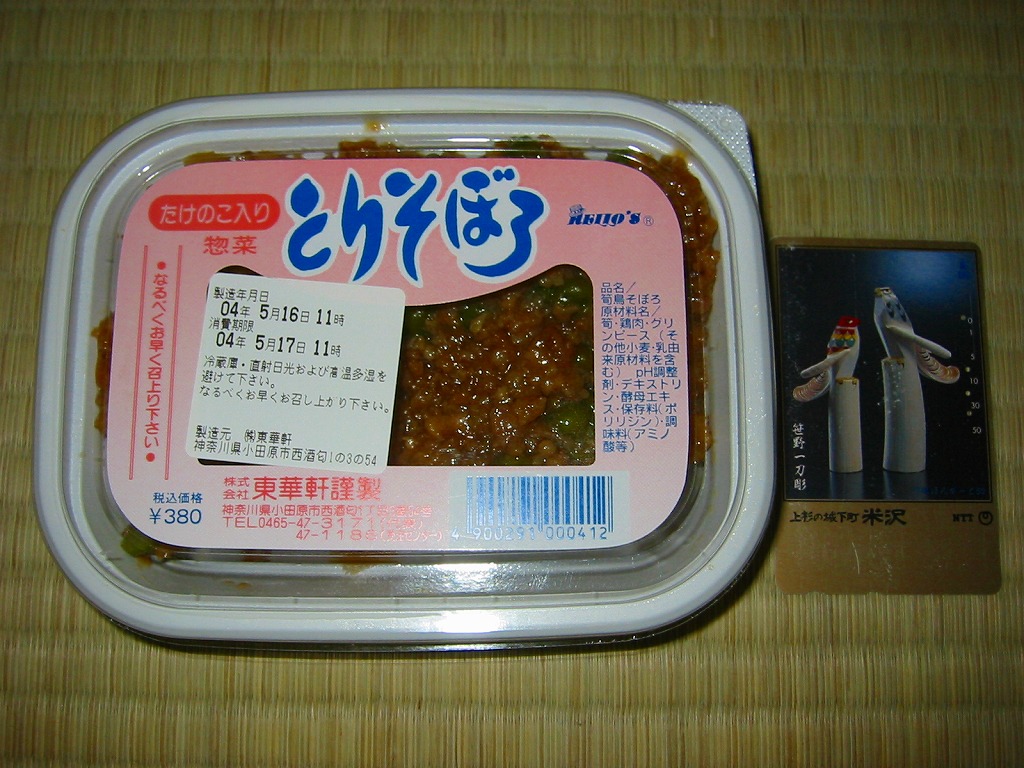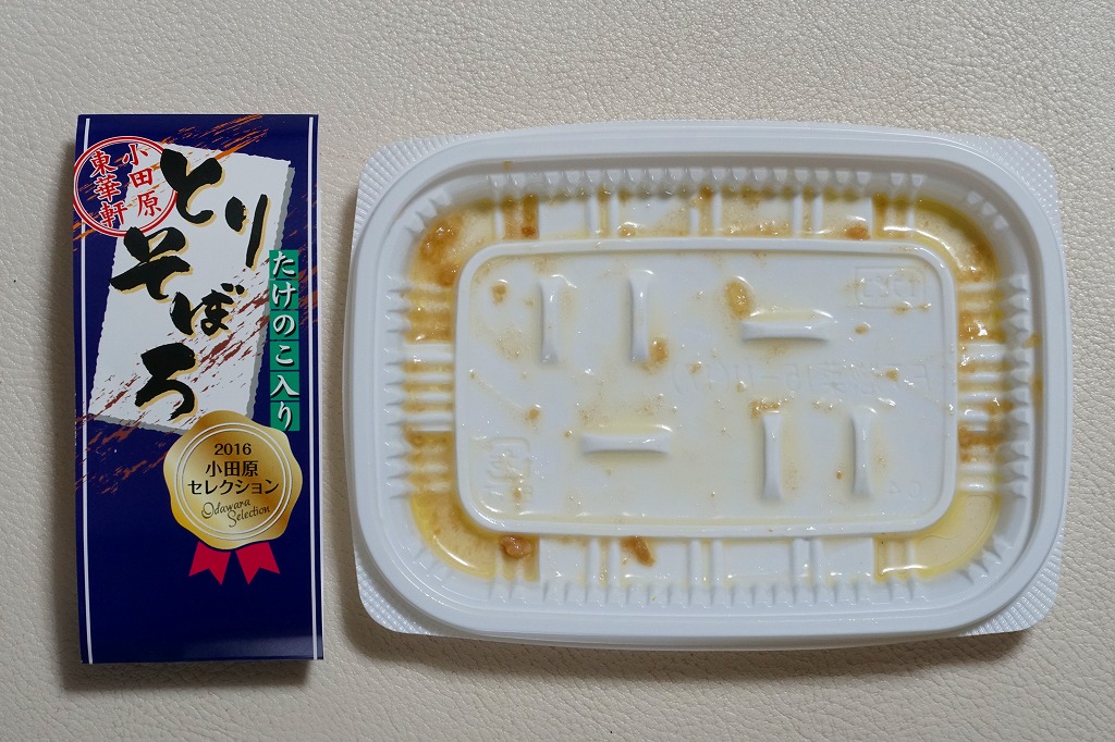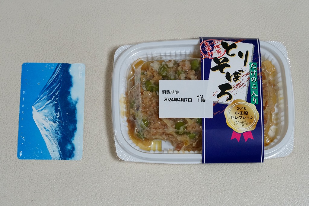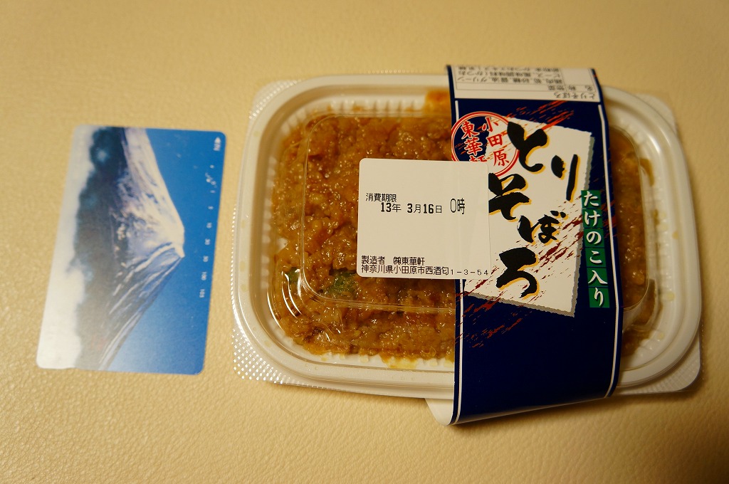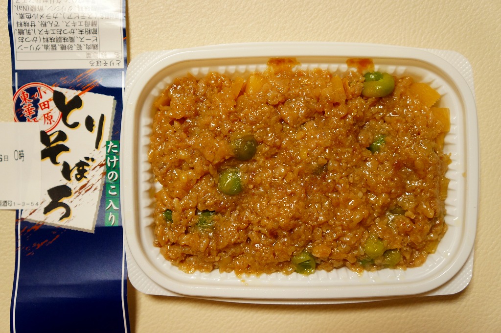 世にも珍しい、おかずだけの駅弁。小田原駅の駅弁「おたのしみ弁当」や「こゆるぎ茶めし」などに入る鶏そぼろのみの商品。調製元の社史には1982(昭和57)年3月21日に280円で発売とある。惣菜向けの小さなプラ製トレーに、グリーンピースとタケノコを混ぜた、とろみのある鶏そぼろが詰まる。焼売や鶏唐揚ならばともかく、鶏そぼろが惣菜売り場でなく駅弁売り場で取り扱われて、冷蔵什器で弁当のみに囲まれて、いったい誰が買うのかといつも思うのだが、こうして難なく買えるのは、ちゃんと売れている証。