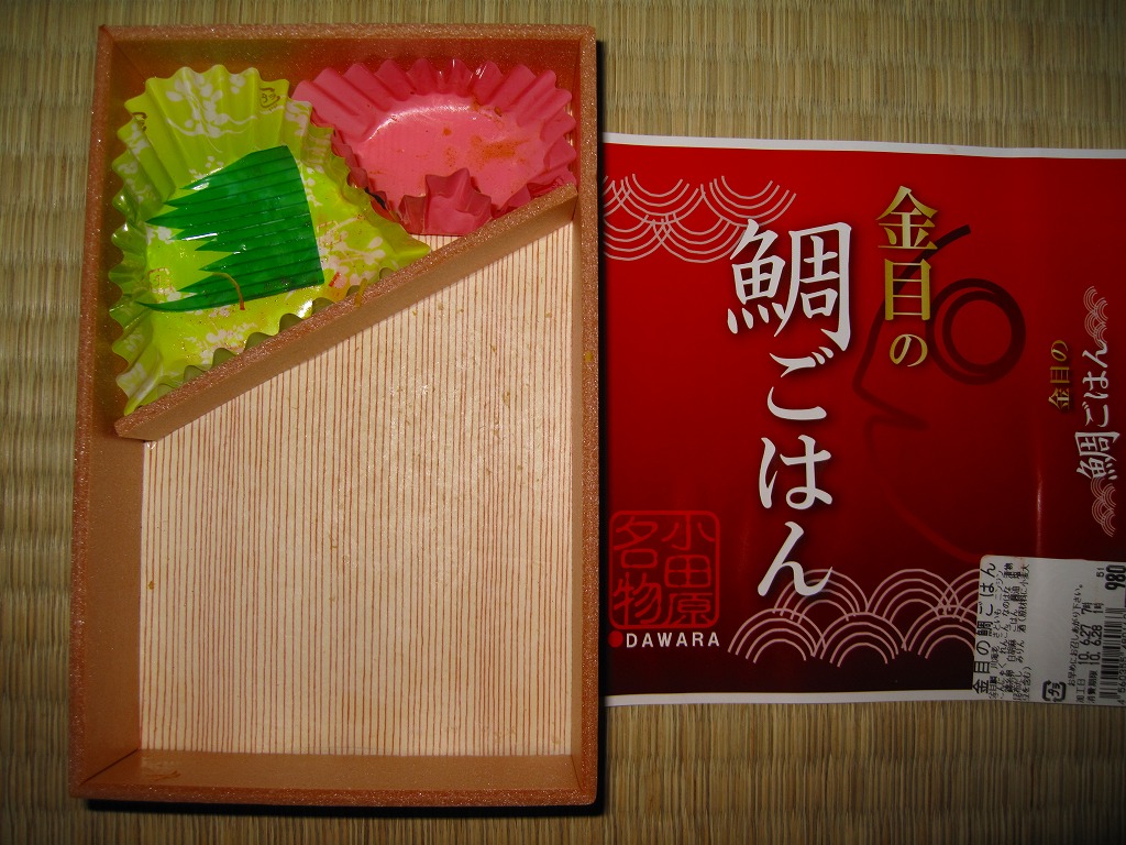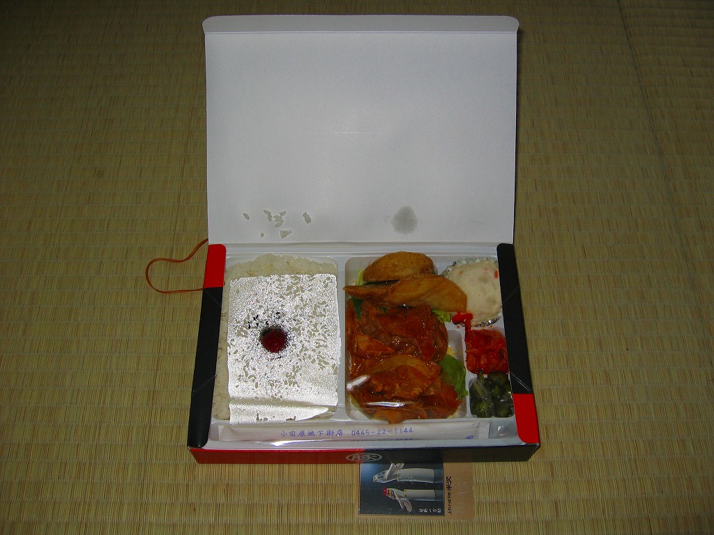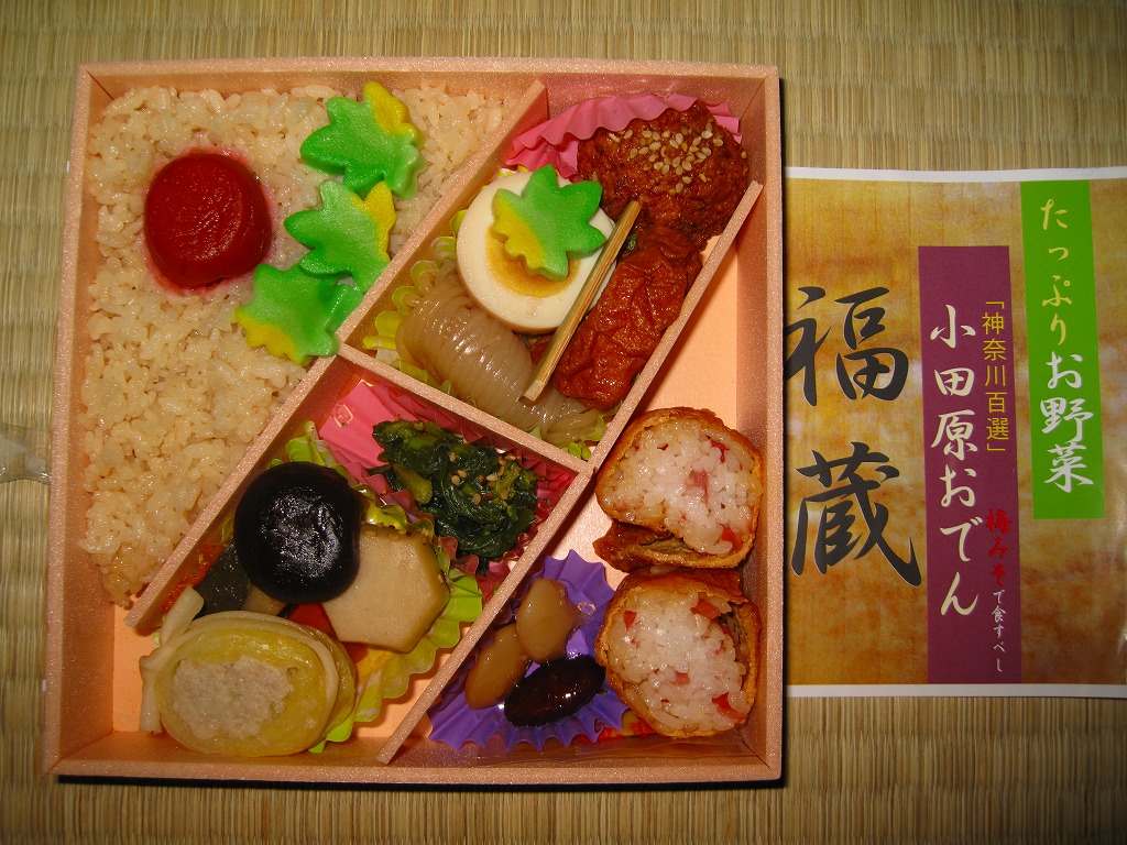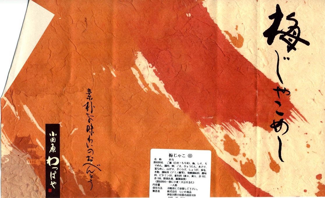 2008(平成20)年に発売か。竹皮を模したボール紙の容器に、商品名の一部を記した茶色の掛紙を巻く。中身は餅米を混ぜておこわのようになった茶飯に梅とじゃこを載せて、鶏唐揚、玉子焼、あさり煮、しば漬ひょうたんなどを添えるもの。梅嫌いなので味を評価してはいけないと思うが、安いのにしっかりしていると思う。また、梅とじゃことは小田原らしい選択。2011年頃まで売られた模様。