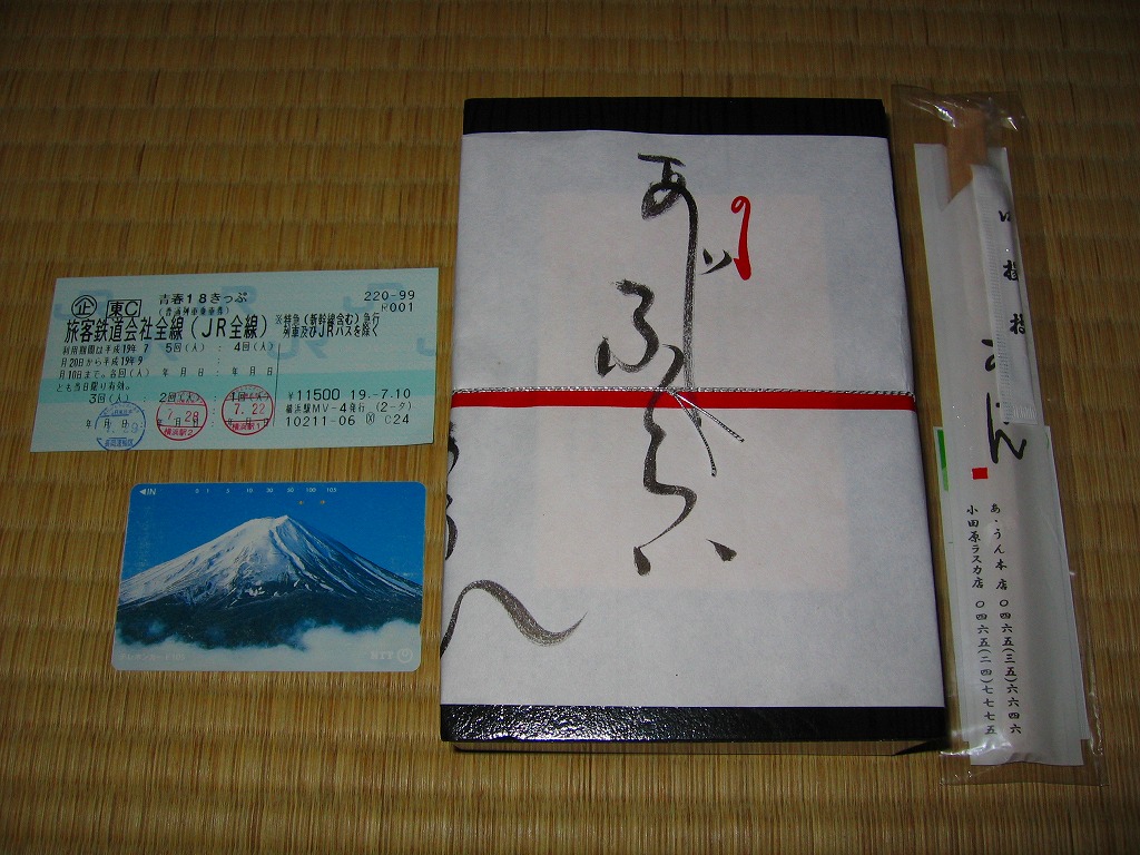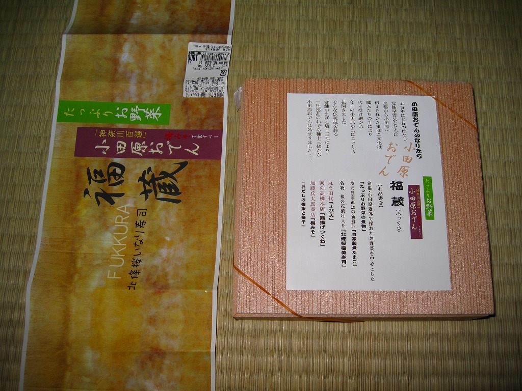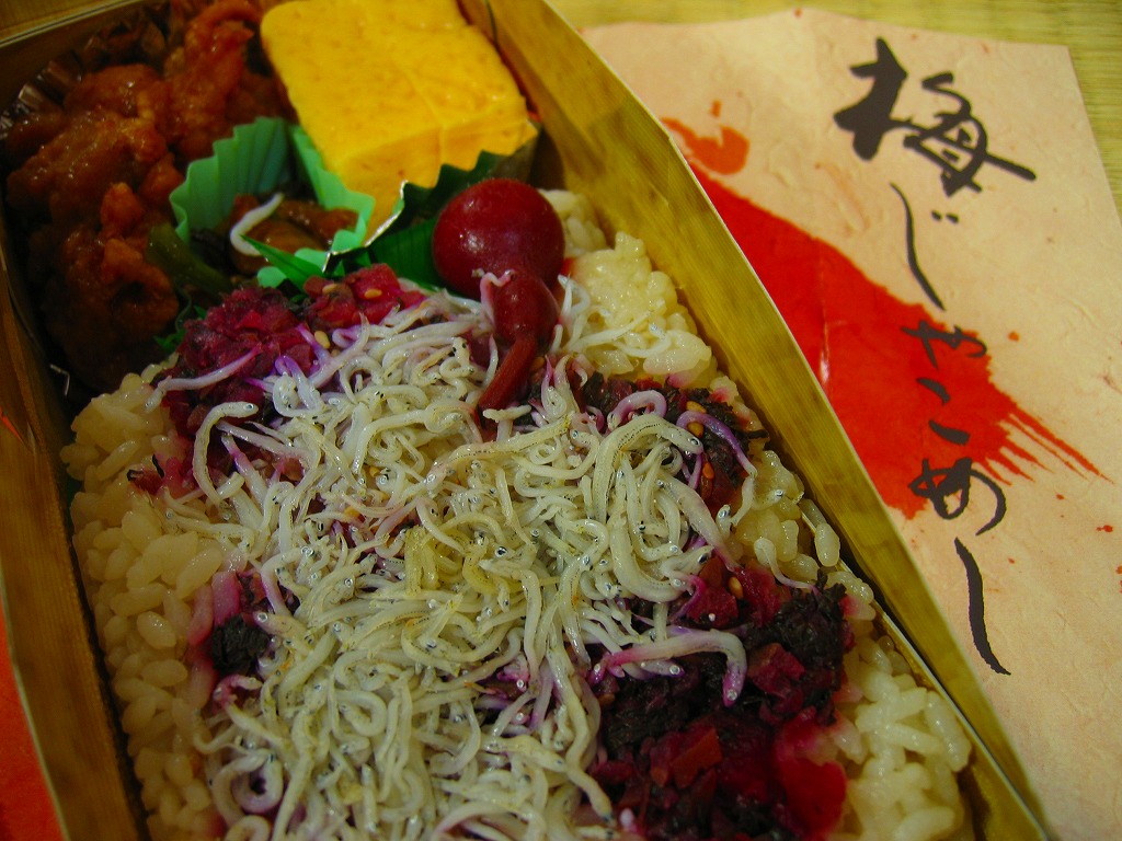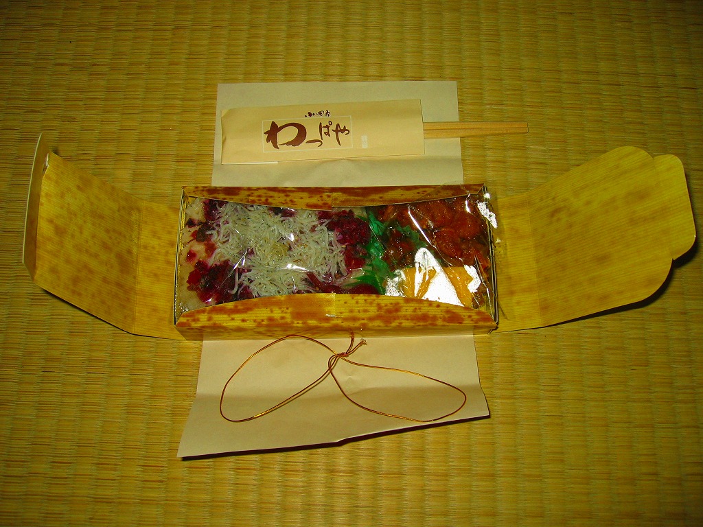 2008(平成20)年に発売か。竹皮を模したボール紙の容器に、商品名の一部を記した茶色の掛紙を巻く。中身は餅米を混ぜておこわのようになった茶飯に梅とじゃこを載せて、鶏唐揚、玉子焼、あさり煮、しば漬ひょうたんなどを添えるもの。梅嫌いなので味を評価してはいけないと思うが、安いのにしっかりしていると思う。また、梅とじゃことは小田原らしい選択。2011年頃まで売られた模様。