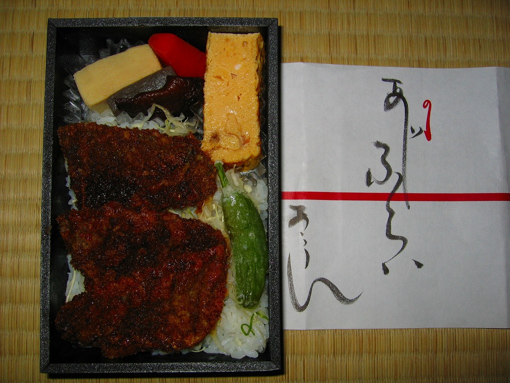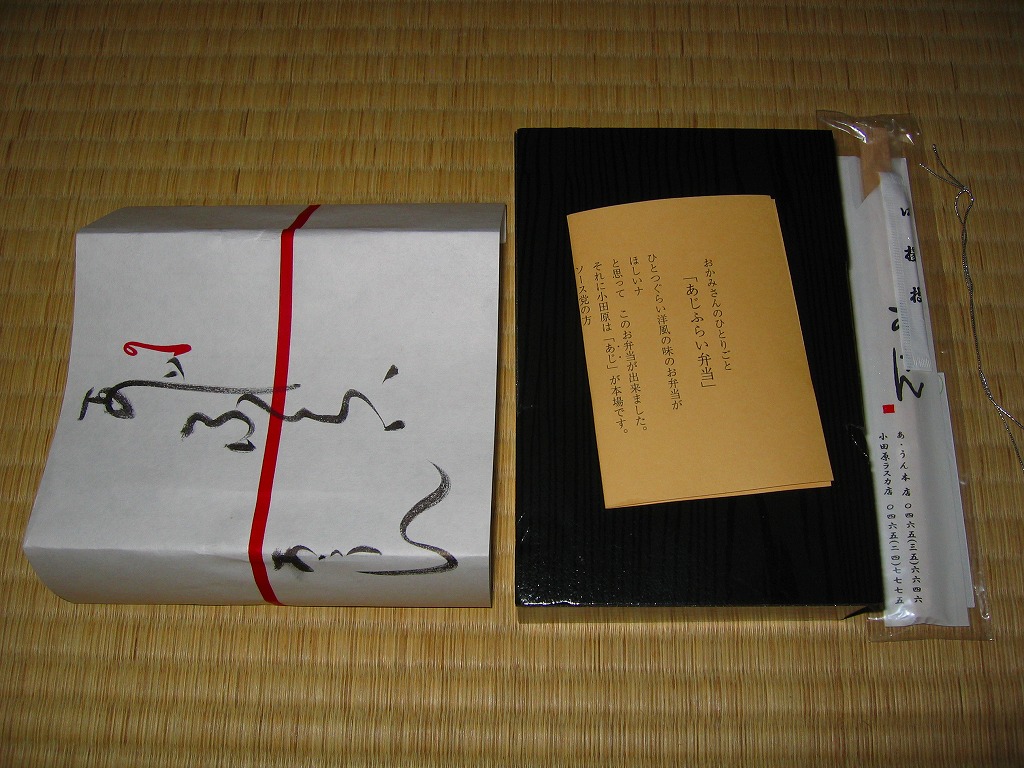 小田原駅の橋上自由通路で、台売りされていたお弁当。黒く分厚い容器に、こちらは同時購入の「しらすご飯」と違い商品見本どおり、色紙に墨書きしたデザインの掛紙を巻く。中身は白御飯の上にキャベツ千切りを敷いて、写真のとおりソースで真っ黒になったアジフライを3切れ載せて、煮物と厚焼き玉子を添えるもの。