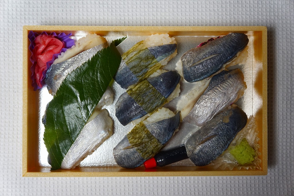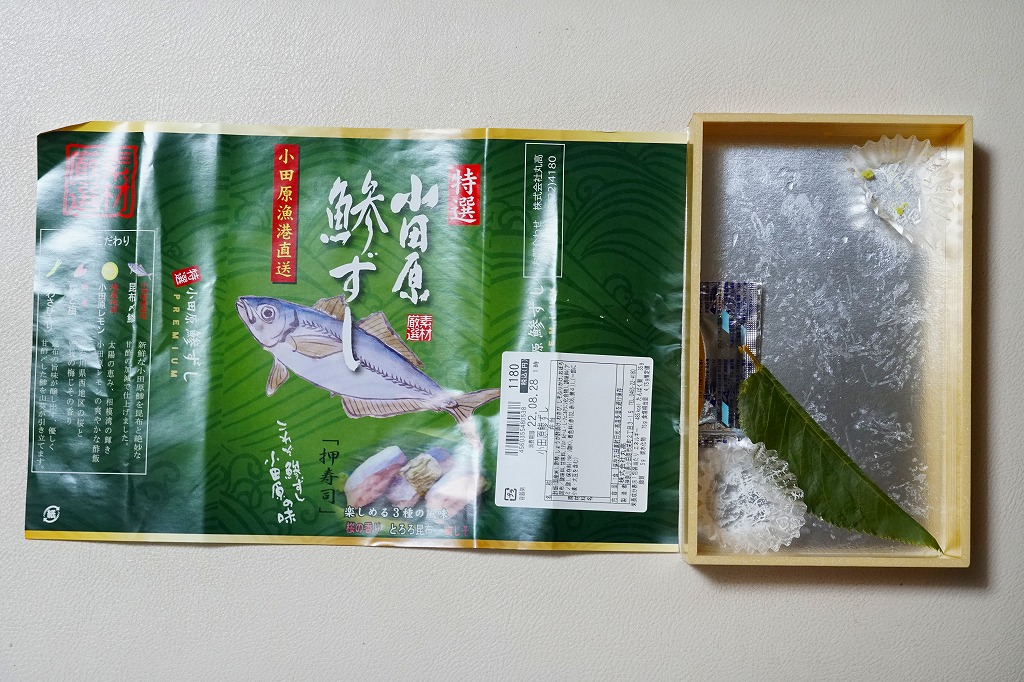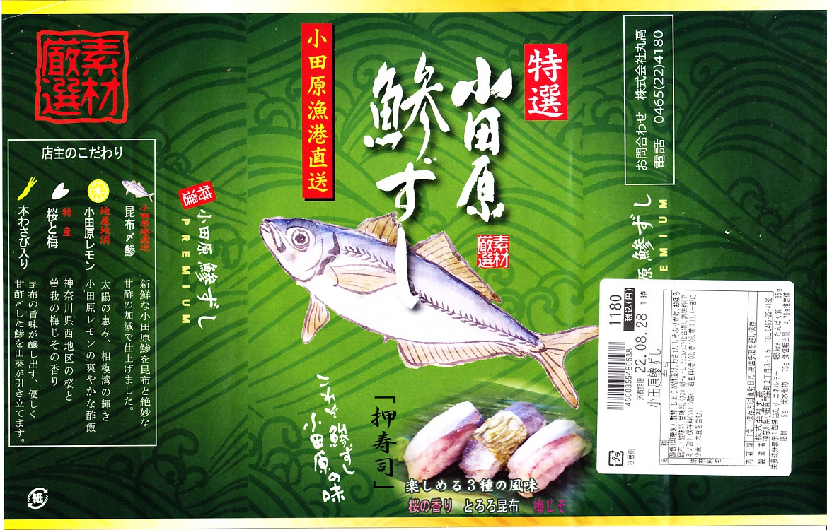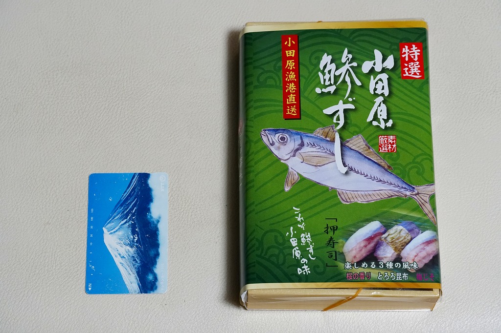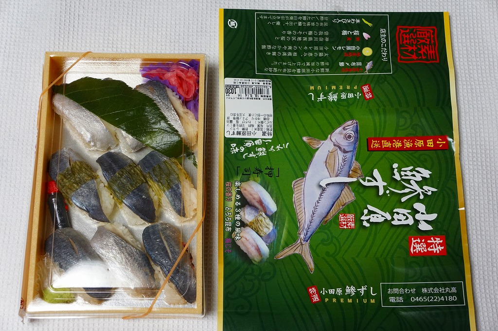 2000年代までには小田原駅で発売か。明治時代に国府津駅で生まれた小田原駅の名物駅弁「小鯵押寿司」に似た、JR駅の公式な駅弁屋でない調製元がつくるアジ寿司。平たい長方形の折箱に、酢飯にアジを合わせた握り寿司を9個並べ、わさびとガリを添える。アジ寿司は、サクラの葉をかけた「桜の香り」3個、昆布の帯を締めた「とろろ昆布」3個、具と飯の間にしそふりかけを仕込んだ「梅じそ」3個。昆布と甘酢でしめたというアジに、小田原レモンを混ぜたという酢飯で、今では酸味の塊となってしまった駅弁の小鯵押寿司よりは、いただきやすく、見た目の輝きもあると思う。