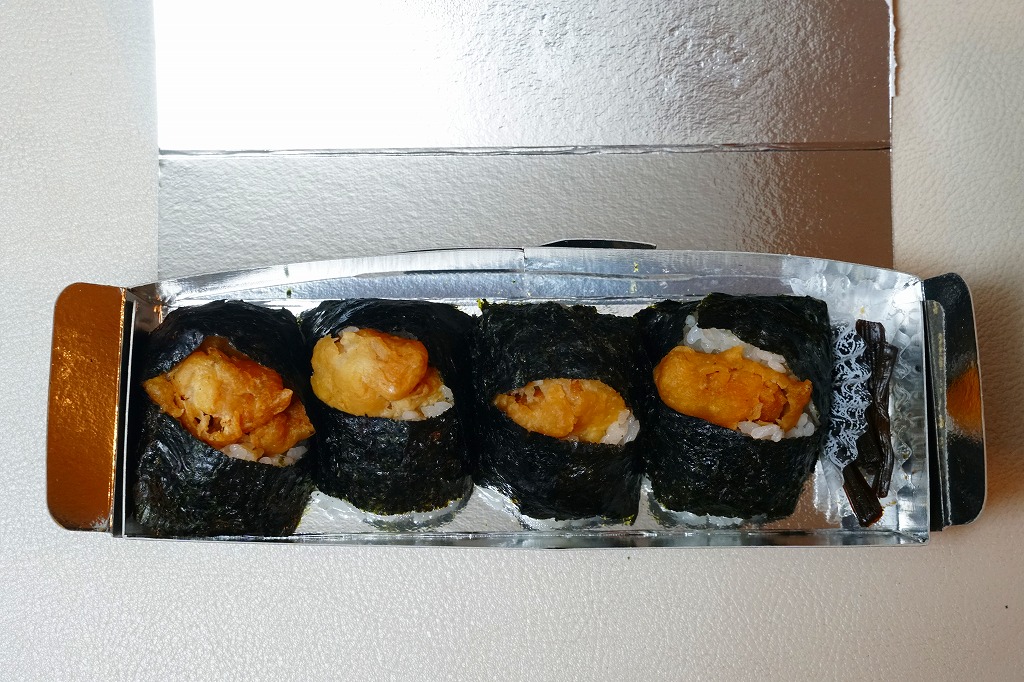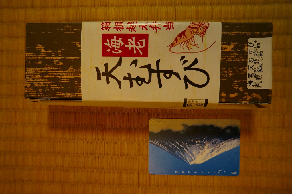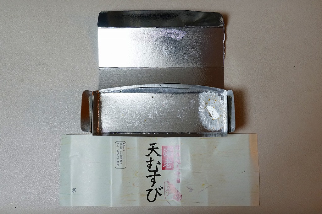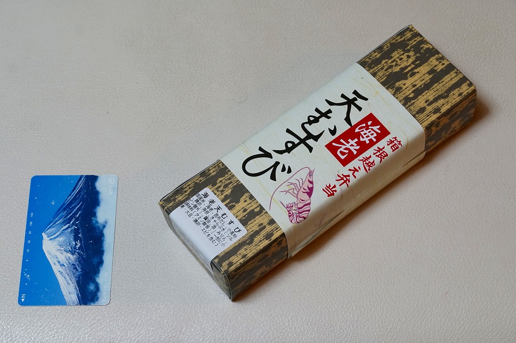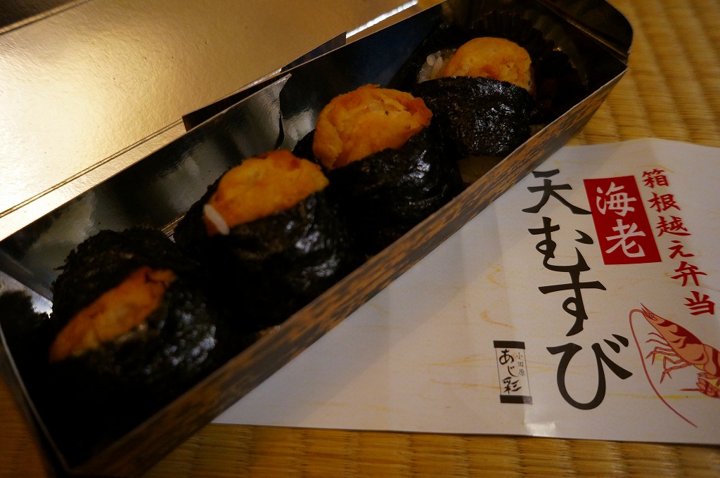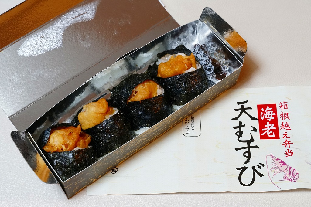 竹皮柄の寿司向け紙容器に、海老天むすびを4個並べ、きゃらぶきを添える。つまり天むす。天むすとしてとくに変わるところはなく、一般的な見栄えと分量と味と値段を持つと思った。「箱根越え弁当」とあるが、これはこの調製元の弁当群に共通する表記なので、これが箱根にちなむものではないと思う。価格は2011年時点でおそらく480円、2012年時点で550円、2014年時点で570円、2025年時点で680円。