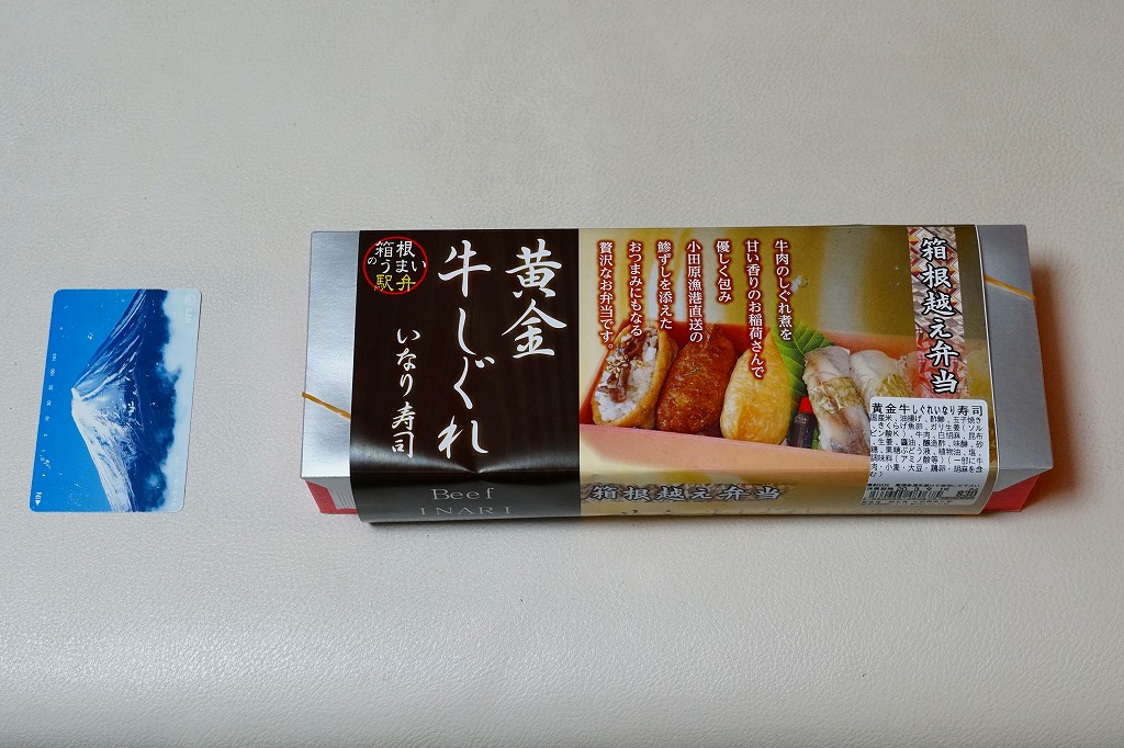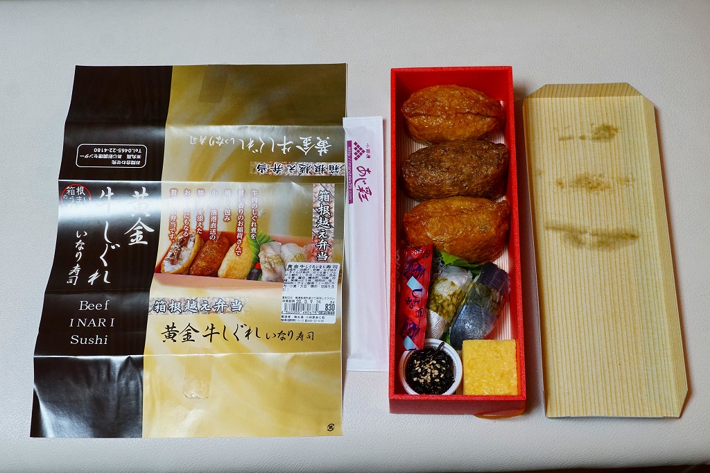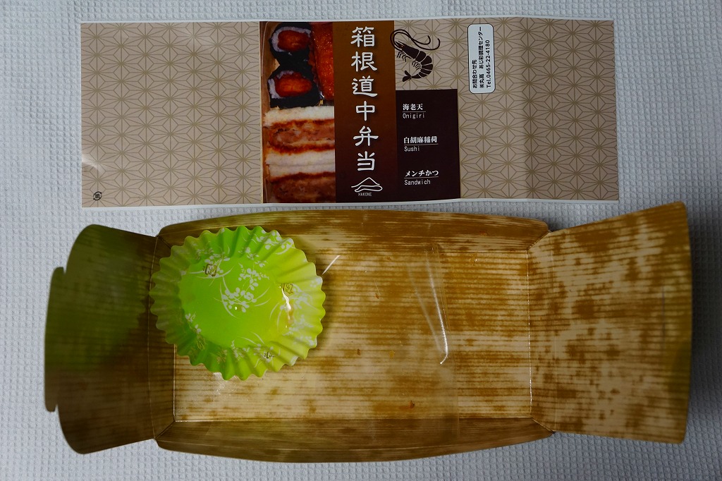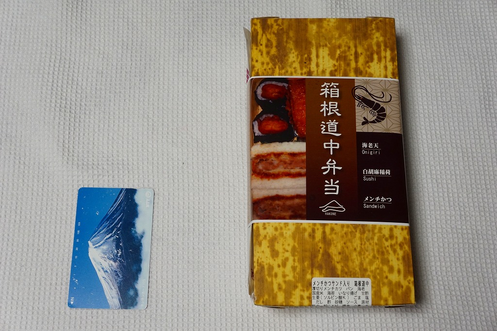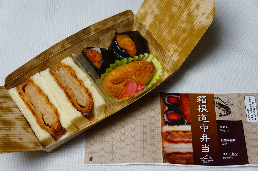 新幹線小田原駅の改札外高架下でJR東海の子会社が運営するコンビニエンスストアで、「駅弁」として陳列し販売されていたお弁当。竹皮柄のボール紙箱に、メンチカツサンド2切れ、海老天の天むす2個、白胡麻いなり1個とガリを詰める。カツサンドも天むすも稲荷寿司も、駅弁としても定番の商品であるが、これらをひとつにまとめたものは初めて見た。進化したおにぎり弁当。「箱根」とは全然関係ないと思うが、こんな道中食もアリ。価格は2012年時点で750円、2014年4月の消費税率改定で770円、2025年時点で880円。