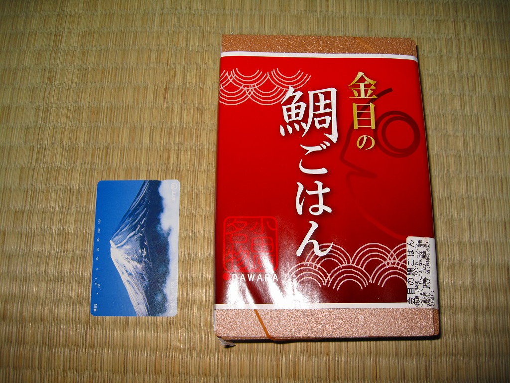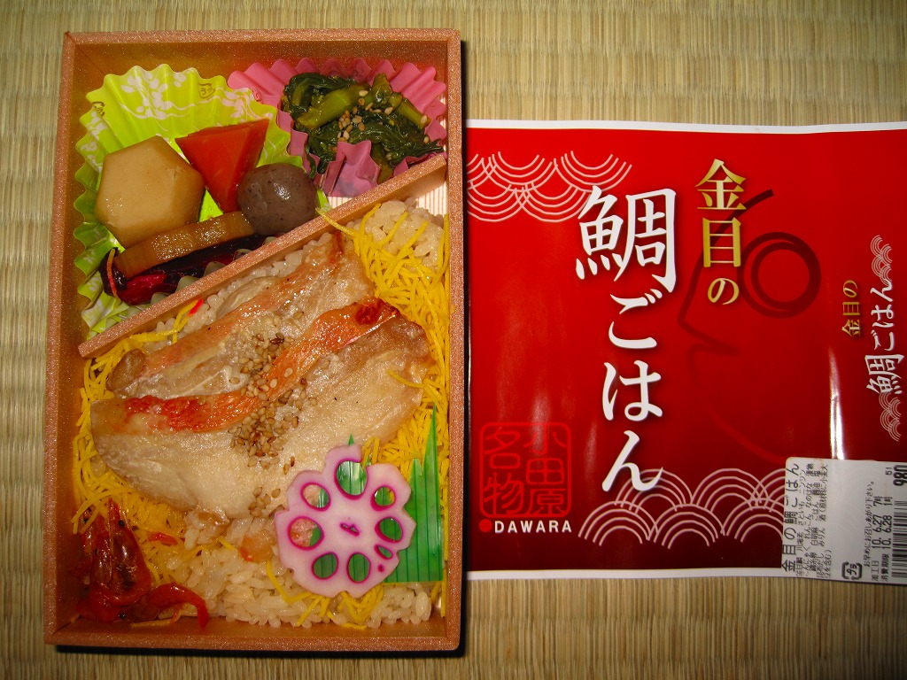 2008(平成20)年までに発売か。長方形の容器に、駅弁の名前をシンプルに書いた赤い掛紙を巻く。中身は混ぜ御飯の上にキンメダイの切り身の焼き物を2枚貼り付け、ニンジンやサトイモなどの煮物、菜の花、柴漬け、川エビなどを添えるもの。御飯や魚はとってもとろける感じ。価格は2010年の購入時で980円、2015年時点で990円。2015年までの販売か。