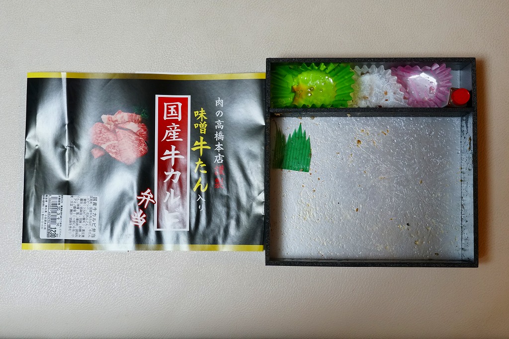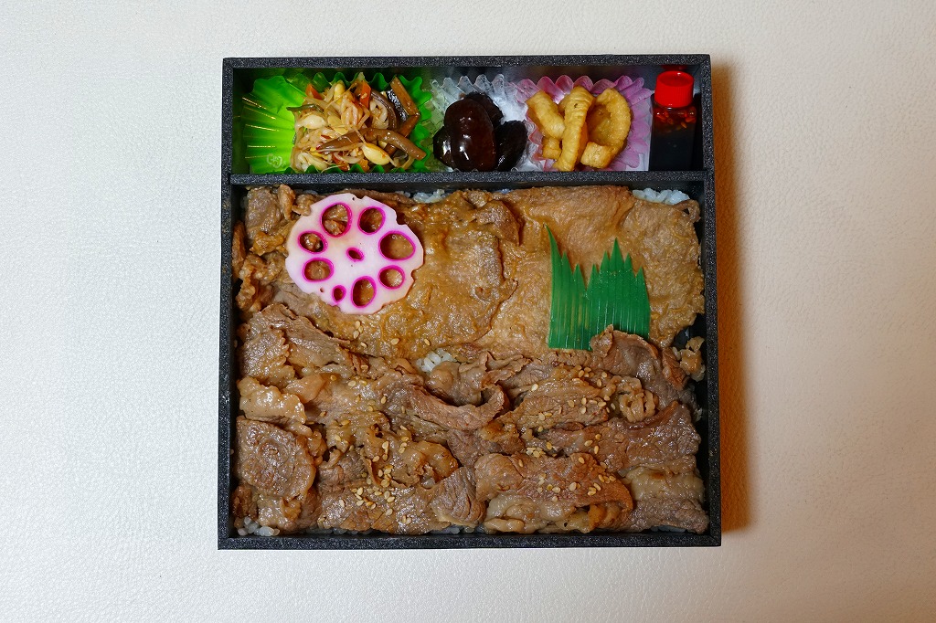 真っ黒な容器に白飯を敷き、固めの牛焼肉と牛たん焼で覆い、花れんこんで彩り、ビビンバと煮豆と漬物とタレを添える。真っ黒な掛紙の絵柄を含め、どこの駅弁か判別が付かないシンプルさ。掛紙に記される肉の高橋本店とは、つまり調製元のことである。価格は2020年時点で1,230円、2024年時点で1,450円。2023年時点で掛紙の表記が「肉の高橋本店謹製」「味噌牛たん入り弁当」「国産牛カルビー」に変わった模様。