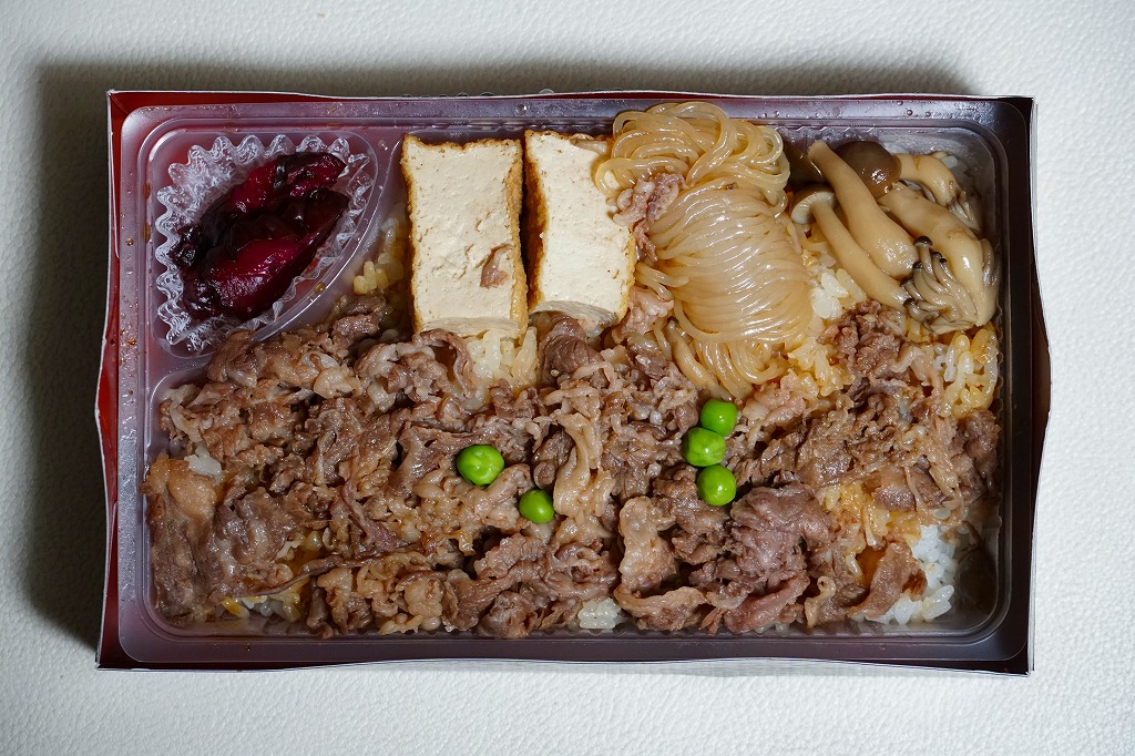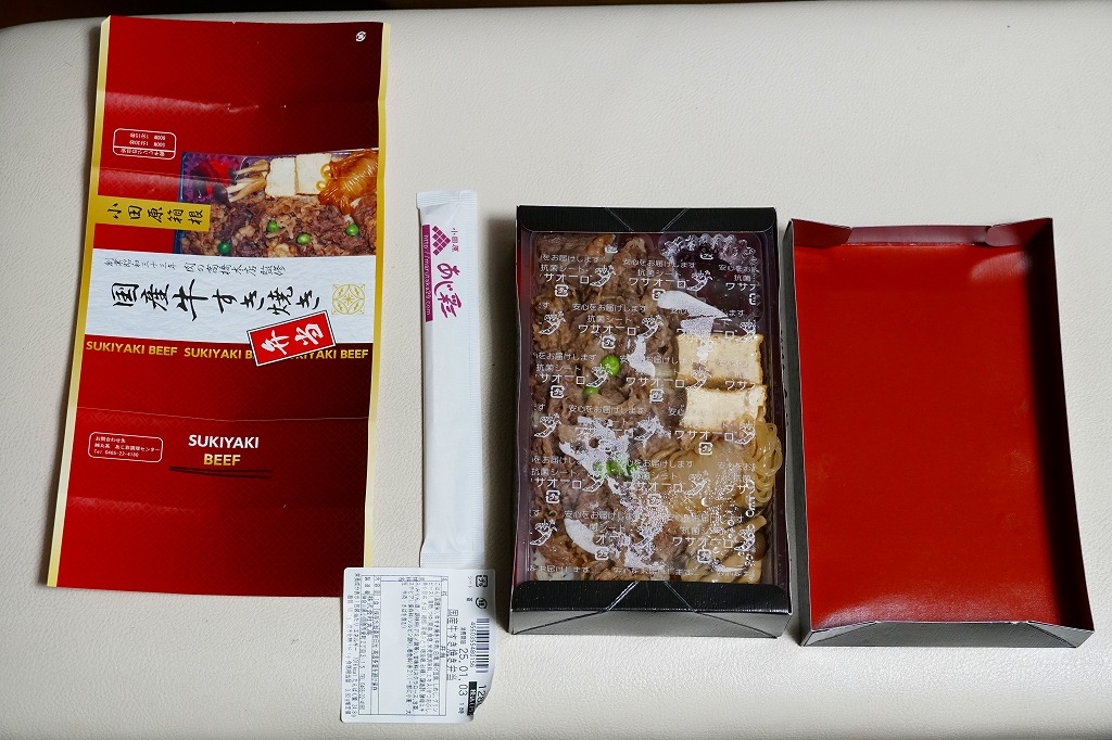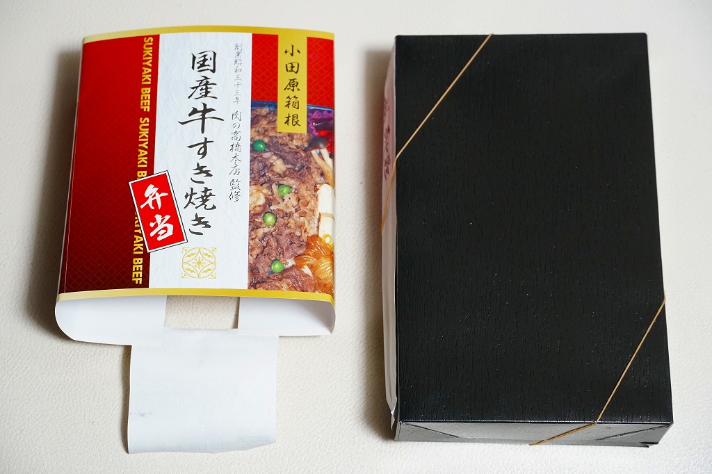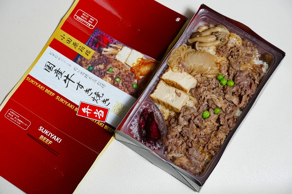 2016年までには小田原駅で発売か。商品名と中身の写真の掛紙を巻く、漆器の色彩を持つ紙容器に詰めた半透明のトレーに、白飯を詰め、国産牛すき焼きとして牛肉煮、しめじ煮、揚げ豆腐、しらたき、グリーンピースで覆い、しば漬けを添える、シンプルな牛肉弁当。「創業昭和三十三年肉の高橋本店監修」とあるが、それは調製元そのものである。価格は2016年時点で1,030円、2025年の購入時で1,280円。