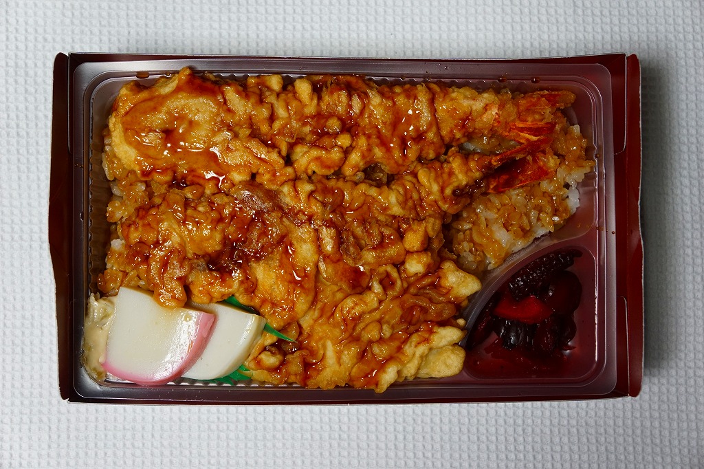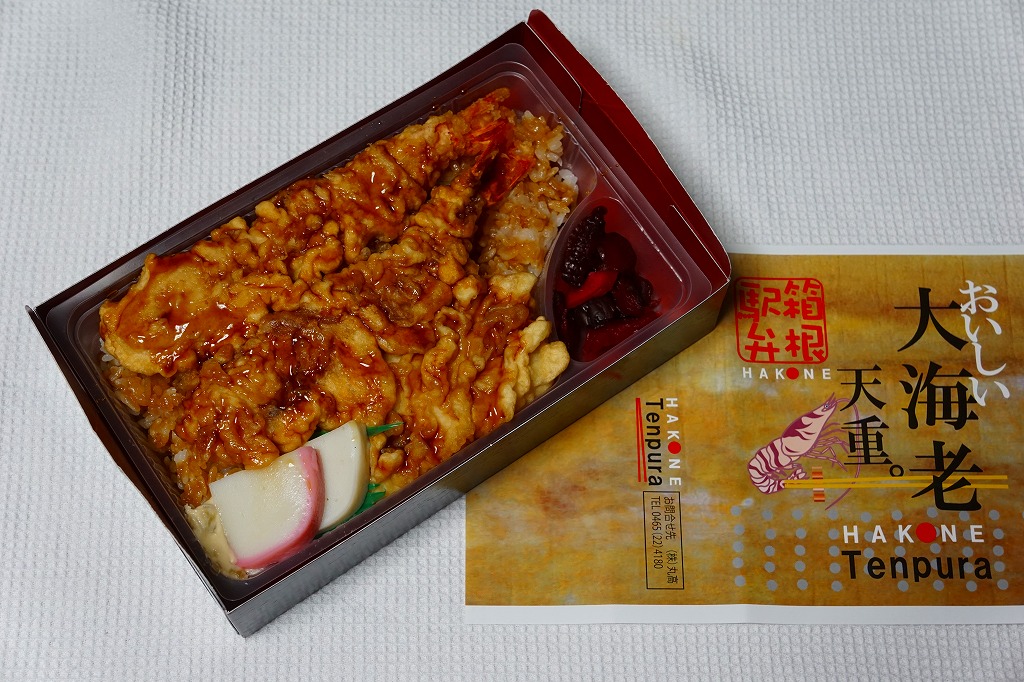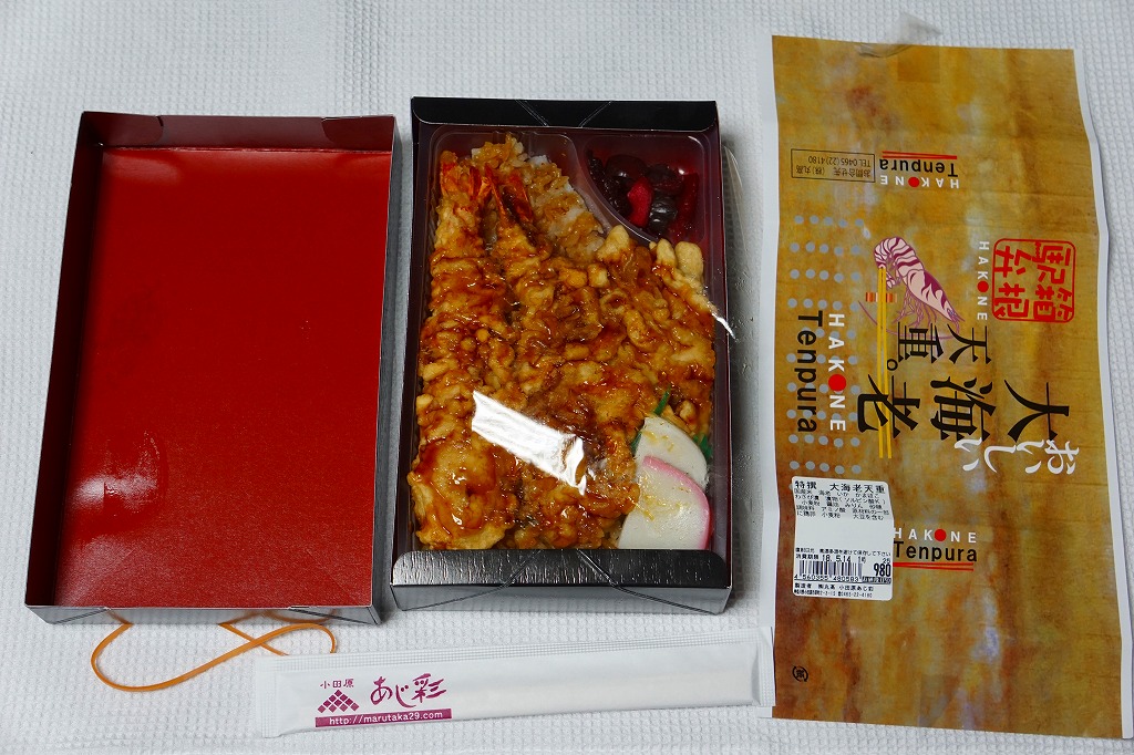 新幹線小田原駅の改札外高架下でJR東海の子会社が運営するコンビニエンスストアで、「駅弁」として陳列し販売されていたお弁当。真っ黒な紙箱に、商品名を今風に描いた掛紙を巻く。半透明のプラ製トレーに収まる中身は、白御飯を海老天で覆い尽くし、天つゆをたっぷりかけ、紅白の蒲鉾とわさび漬と柴漬けを添えるもの。厚めの衣はふわふわで、常温でも油くさくなく、これはなかなか強力なお弁当。価格は2011年時点で950円、2014年4月の消費税率改定で980円、2025年時点で1,080円。
