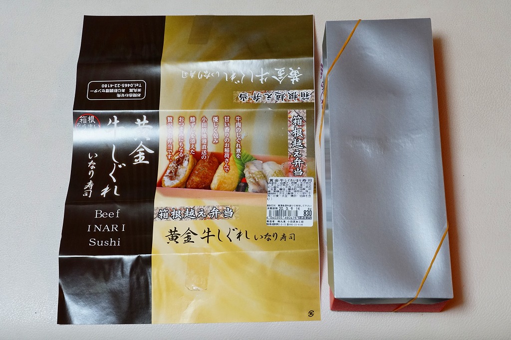 小田原駅の駅弁売店で買えた稲荷寿司。ふたに宣伝文を印刷したボール紙製の紙箱に黄色い掛紙を巻いている。中身は黒ゴマや黒ミツを混ぜて黒くなった酢飯を海苔と油揚げで巻いた、棒状のおいなりさんが3本、それぞれ4切れにカットしてぴったり収めるもの。風味はふんわり、適度なサイズと水気で口にポンポン入っていく。