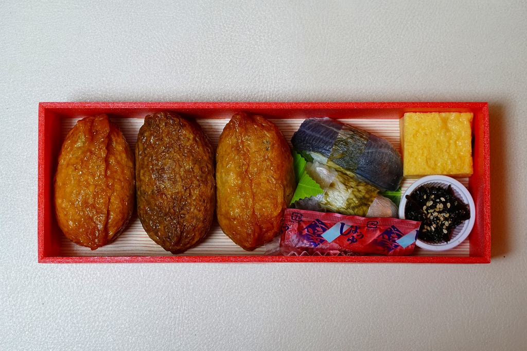 細長い容器に掛紙の見本写真のとおり、稲荷寿司3個、アジ寿司2個、昆布カップ、玉子焼を並べる。おいなりさんは個々に見た目が異なる3色稲荷に見えて、中身はすべて同じ牛しぐれ煮だった。駅弁らしい見た目とつくりと値段を持つ、軽食と一食の中間品。2023年頃までの販売か。