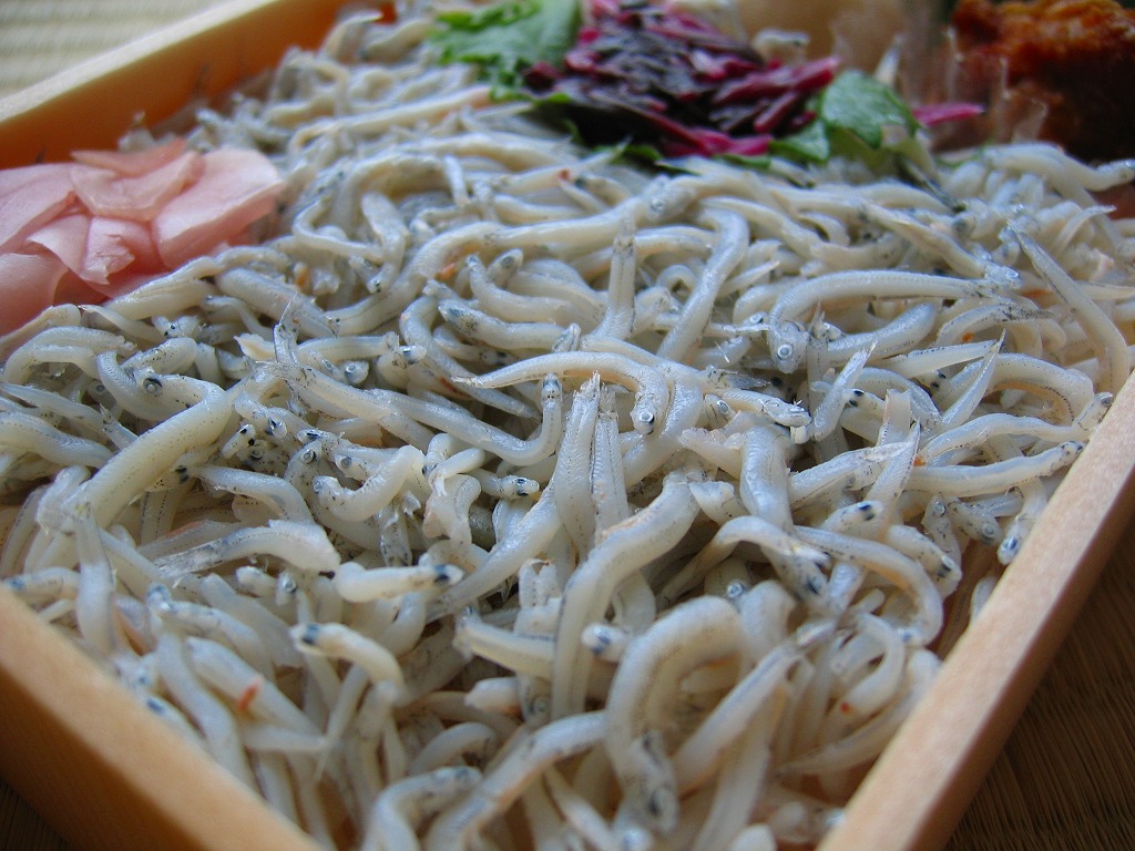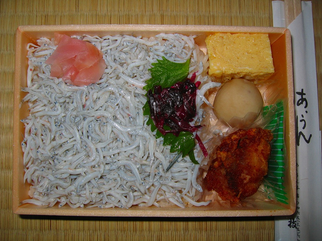 小田原駅の橋上自由通路で台売りされていたお弁当。商品見本では色紙に墨書きしたデザインの掛紙を巻いていたが、実物はこのとおりの惣菜弁当。中身は白御飯の上にしらすをたっぷり敷き詰めて、厚焼き玉子や里芋や鶏唐揚を添えるもの。素っ気ないけど、かわいらしい。