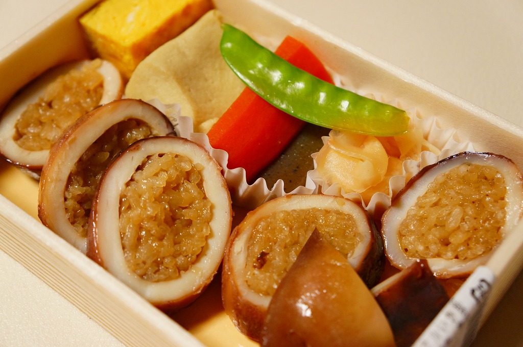 イカ飯のスライスと、玉子焼と、ニンジンや高野豆腐などの煮物を、浅く小さな箱に詰める。ただのお惣菜に見えて、中身は確かなオリジナルだと思うし、駅弁も多く扱う弁当売店で売られるので、これもきっと小田原駅弁。現存しないと思われる。