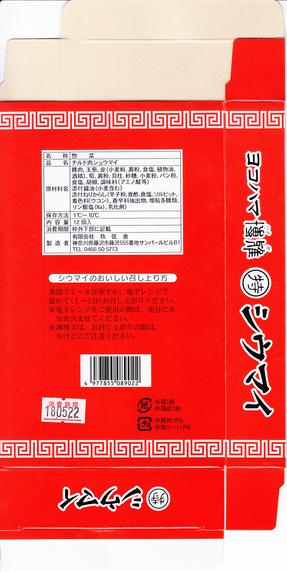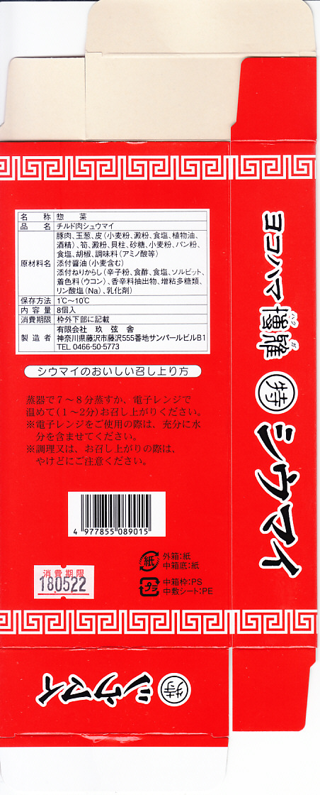 上記の「ヨコハマ博雅(特)シウマイ」の、8個入りバージョン。3年前と同じ売店で、小田原名物として売られていた。黒い箱が赤くなり、ふたを開く構造がただの箱になり、焼売が6個から8個に増えて、価格は25%増し。臭みのあるふわふわした肉焼売を、竹皮柄の紙トレーごと真空パックする、要冷蔵の土産物である点は変わらない。名前がまた変わった調製元の所在地は、JR藤沢駅前のデパート「さいか屋」と同じ。
