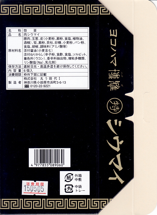 小田原駅でしぶとく残る駅売り焼売に、赤い紙箱の通常版に加えて黒い紙箱の特製版が出たのかと思って購入したら違った。かつて横浜市内で買えた焼売の名を名乗っており、しかし調製元が小田原の蒲鉾屋であり、しかも製造者固有記号が付いているという、属地が不詳な商品。