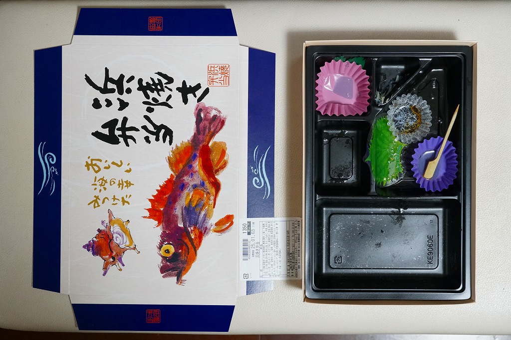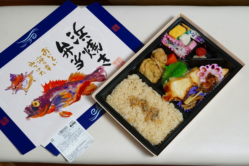 黒いトレーをふたつ入れたボール紙のパッケージは、手に持つだけで重量感がある。中身は柔らかくたっぷりの茶飯、分量のあるカレイ西京焼、紅白のかまぼこに玉子焼、五目巾着や煮物類など、分量と品質の両方を同時に満足できる内容。価格は2004年時点で1,000円、2015年時点で1,230円、2024年時点で1,350円。