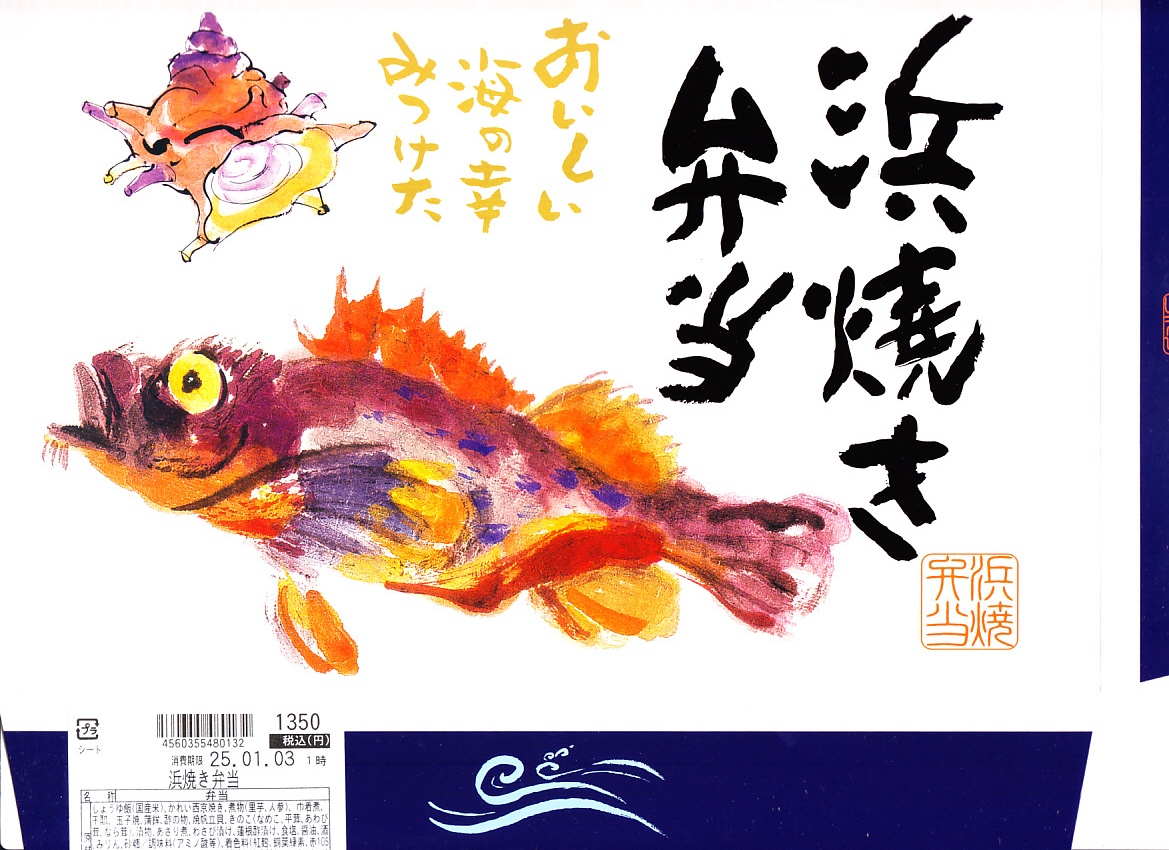 上記の駅弁「浜焼き弁当」の、2004(平成16)年時点での姿。ふたの絵柄は変わらず、内容も上記の2025年のものとほぼ同じ。当時は食品表示ラベルに「保存温度10℃以下」とあり、駅弁らしくなく常温に弱かった。