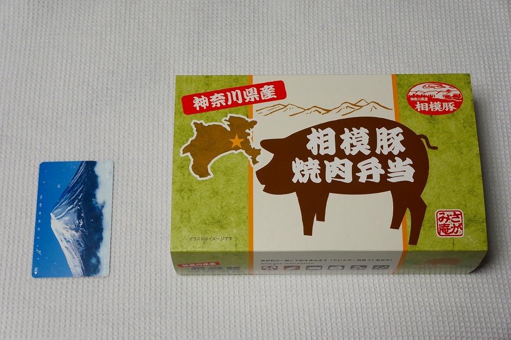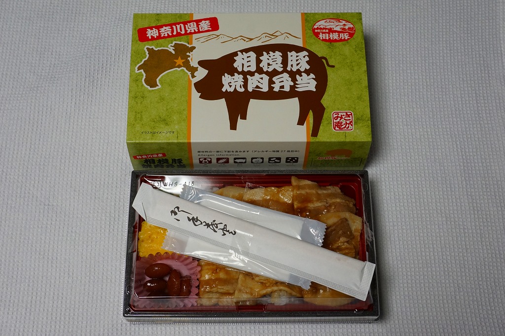 2017(平成29)年の発売か。小田急電鉄の孫会社の「さがみ庵」ブランドの弁当で、小田原駅に限らず、小田急電鉄の駅売店「Odakyu OX」各店で売られる模様。長方形の容器に透明なふたをして、商品名に神奈川県と豚のシルエットをデザインしたスリーブに収める。白御飯を9切れの豚バラ焼で覆い、玉子焼と小松菜と金時豆を添える。水気の少なさも常温の味も、JRの公式な駅弁屋の駅弁と同じような感じ。豚は薄くて柔らかく、タレの味が出て臭みのない、今風の豚丼。2019年までの販売か。