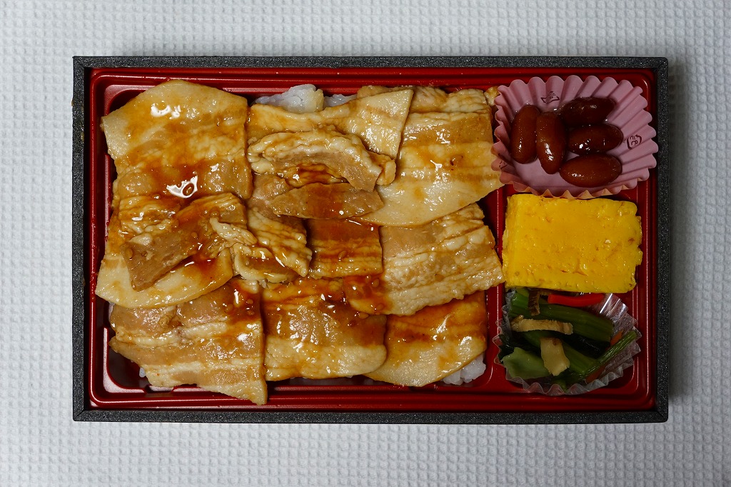 トレーを入れたボール紙パッケージの中に、日の丸御飯ととても柔らかな国産豚ロース肉生姜焼に、ポテトサラダやフライドポテトや生野菜などを詰める。小田原駅自由通路内の駅弁山積売店で入手した、小田原市内の食肉店兼惣菜屋の駅弁風弁当で、肉屋と惣菜部門で使い分けるのか、同じ調製元の「箱根めぐり道中おにぎり」と比較して、調製元の電話番号が1番だけ異なる。価格は2004年の購入時で800円、2015年時点で980円。2021年頃までの販売か。2024年までに「箱根山とん焼&蕎麦つゆしゃぶ弁当」(1,180円)を発売。