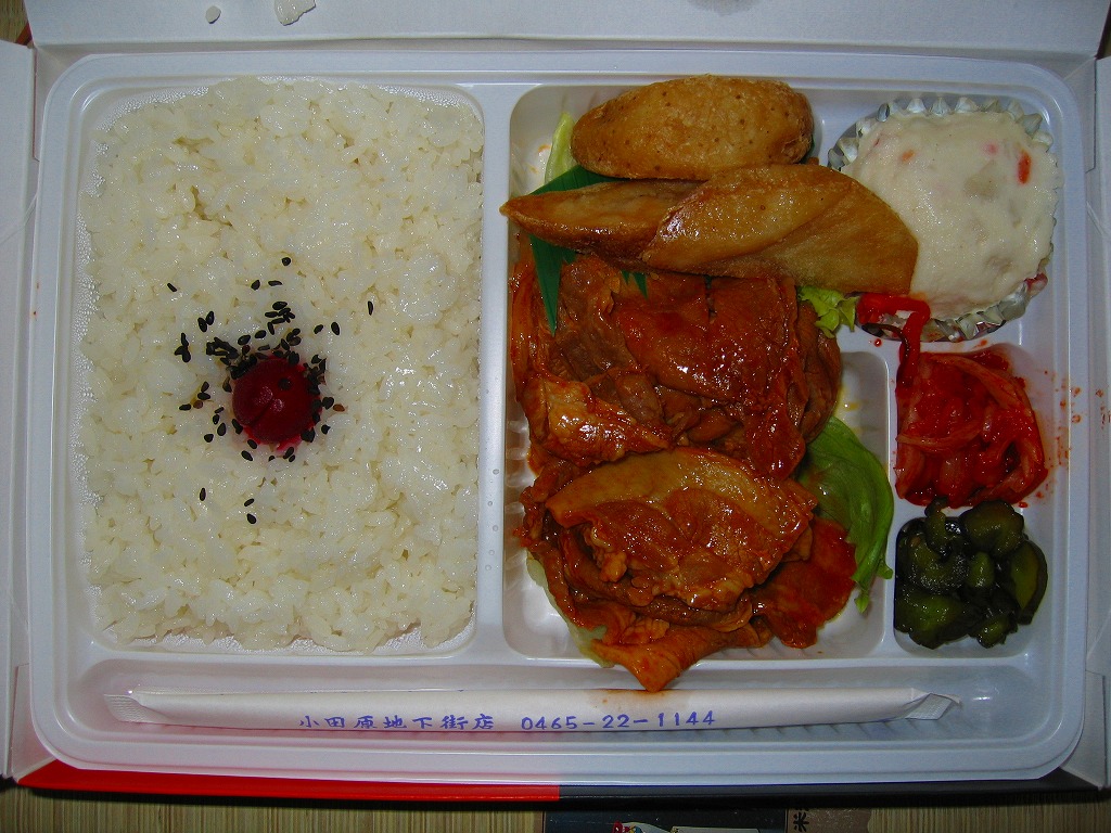 小田原駅の橋上自由通路でブース販売されていたお弁当。プラ製の惣菜容器に、弁当名を大きく記した掛紙をかけて、濃緑色の輪ゴムでしばる。中身は日の丸御飯に豚生姜焼やナスや小魚や玉子焼など、内容も味も格別なものはないし地域色もない。