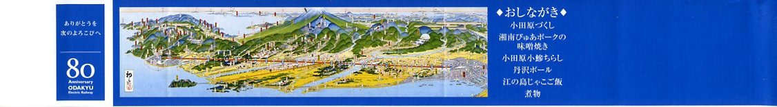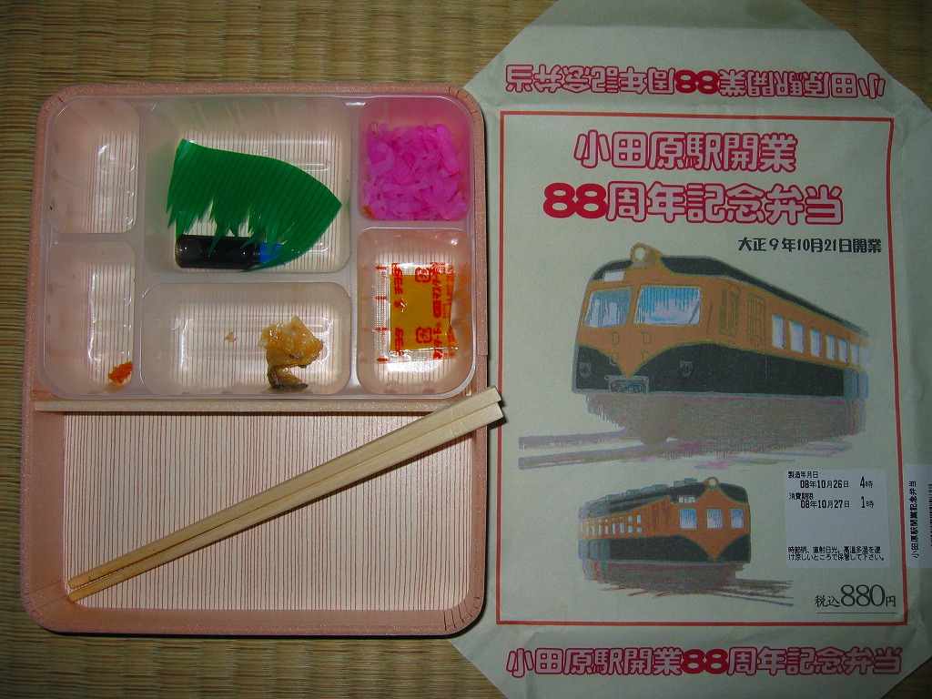 小田原駅の橋上コンコースのウォークイン売店前で、小田原や箱根湯本の駅弁に混じり販売されていたお弁当。プラ製の惣菜容器に紙帯を締め、その帯には小田急線開業80周年のロゴマーク、縮小がきついが当時の全線俯瞰図、おしながきが描かれる。