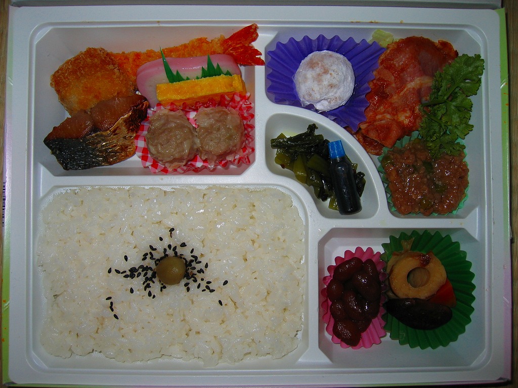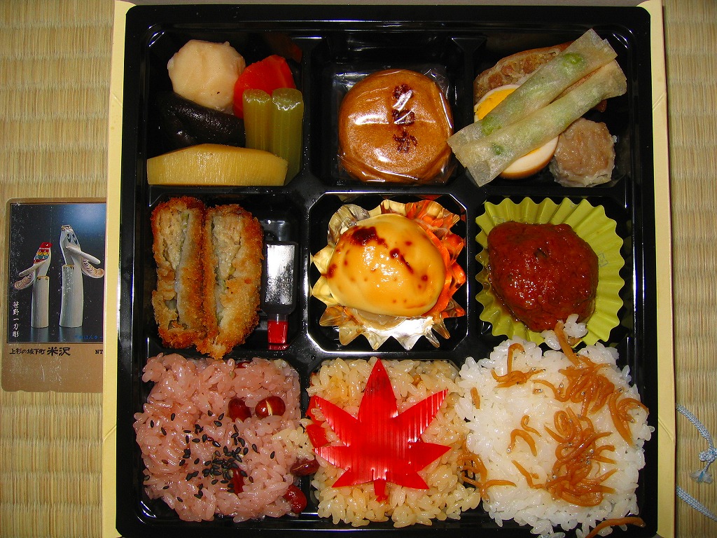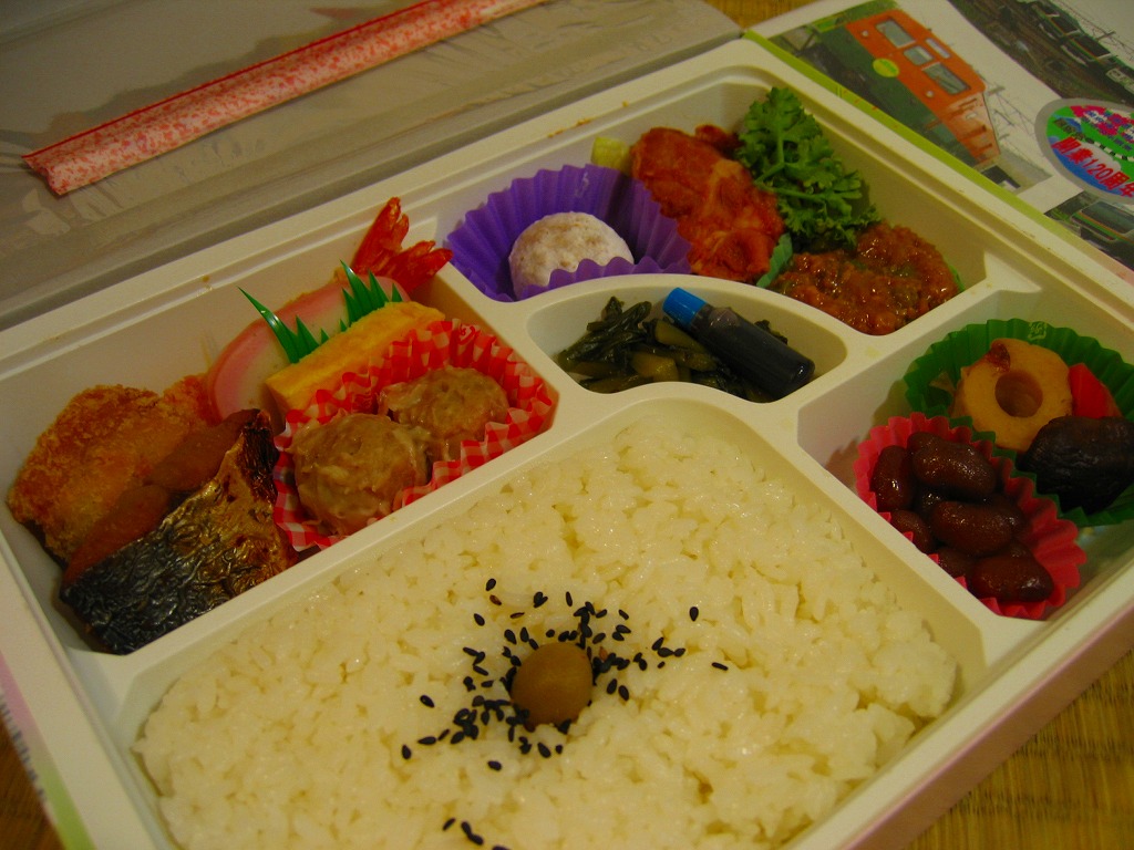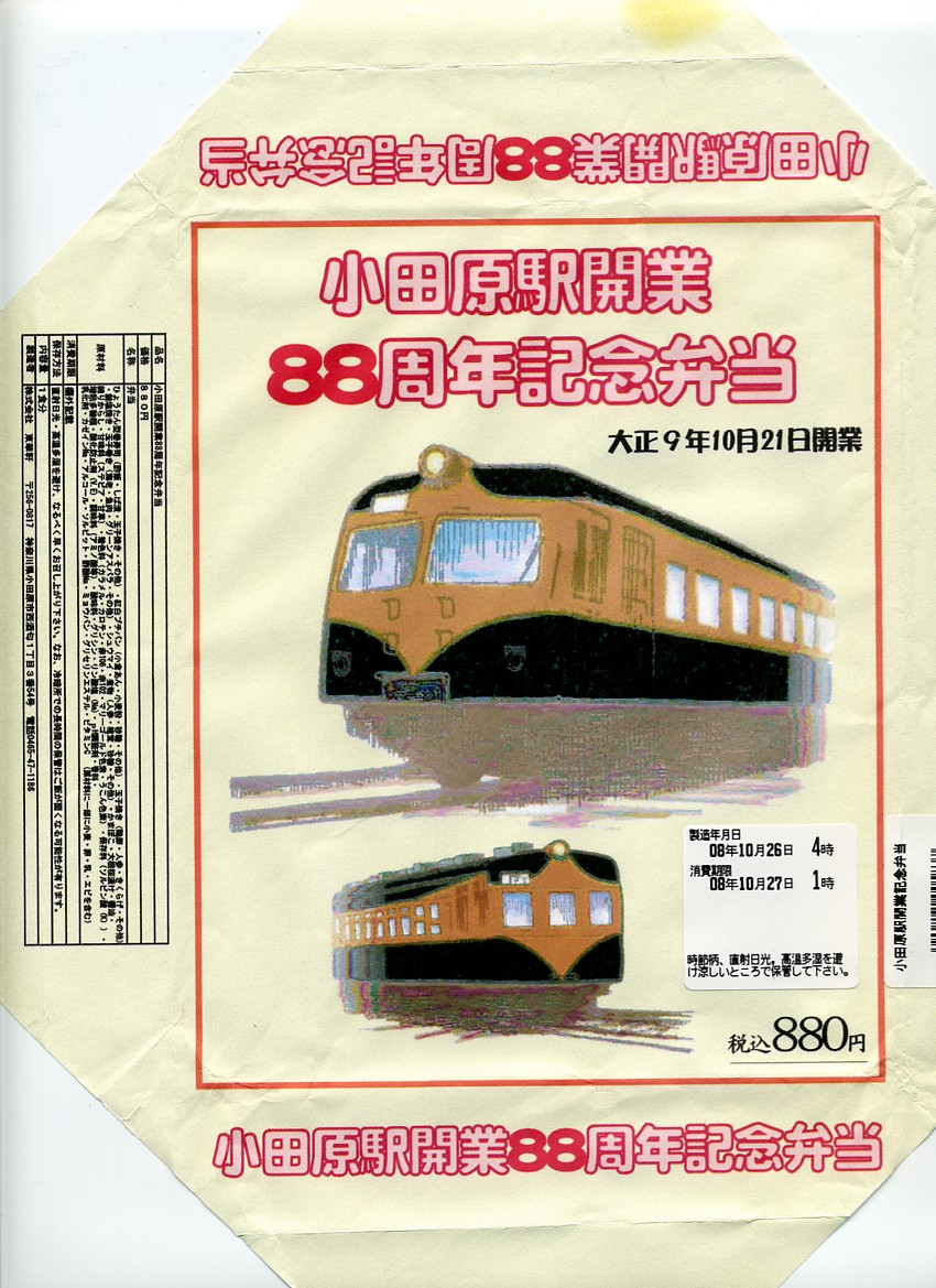 小田原駅の開業88周年を記念して、2008(平成20)年10月に販売。木目調の紙底な容器に経木のふたをかけ、昭和20年代の湘南電車を描いた掛紙をかけて、紅白のひもで十字にしばる。半透明のトレーに入った中身は、玉子の細巻きと柴漬けの細巻き、紅白のまんじゅう、シュウマイ2個、鮭の塩焼き、煮物にカマボコに大根桜漬けなど。