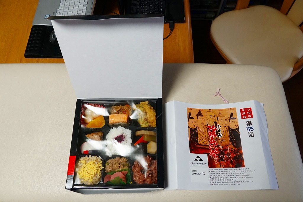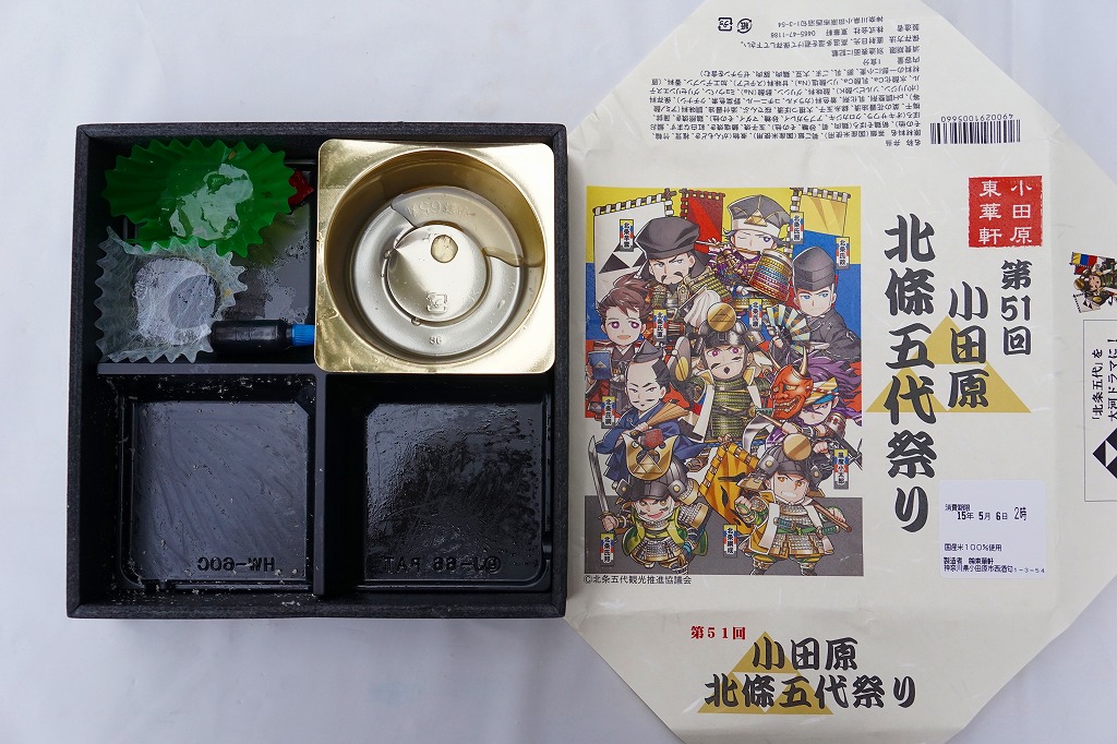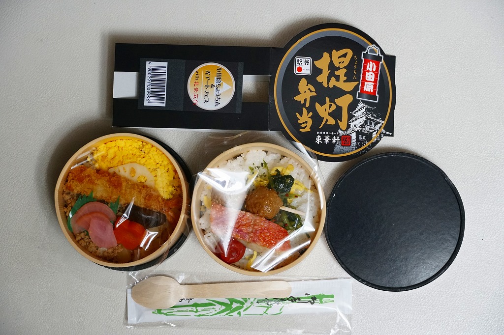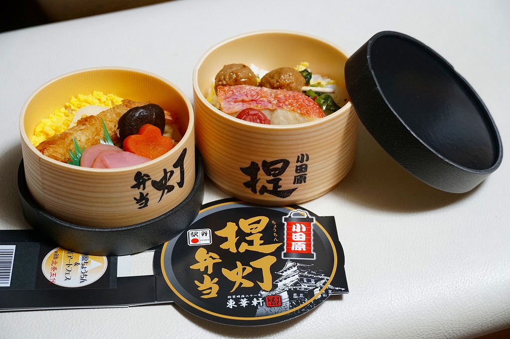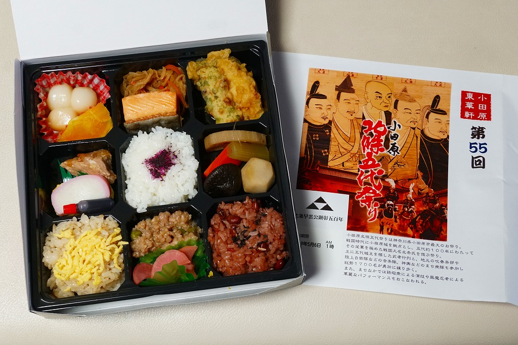 2021(令和3)年5月1日から4日まで小田原駅で販売。ゴールデンウィークと、5月2日から3日までの開催を予定していた第57回小田原北條五代祭りに合わせたものか。その姿はまるで、昭和50年代の小田原駅の名物駅弁「ちょうちん弁当」が復活したように見えた。もとは2020(令和2)年の6月までに、小田急ロマンスカーの車内販売(2021年3月で廃止)で、3日前12時までに予約が必要な弁当として誕生したものらしい。