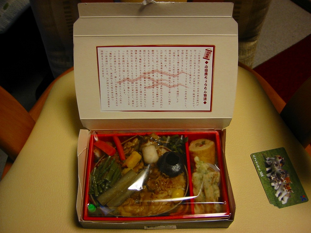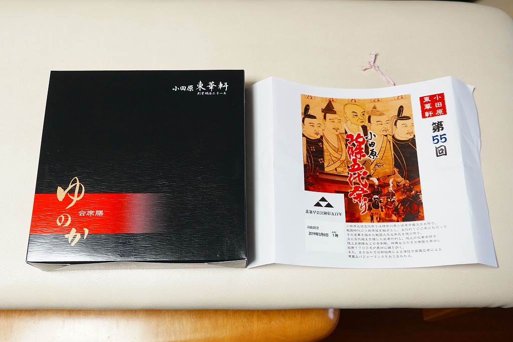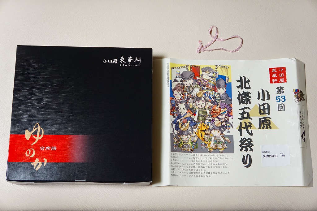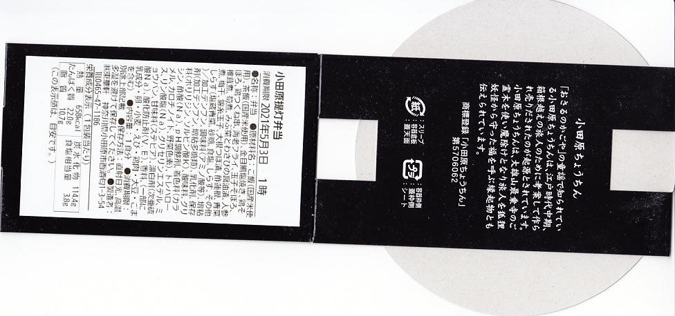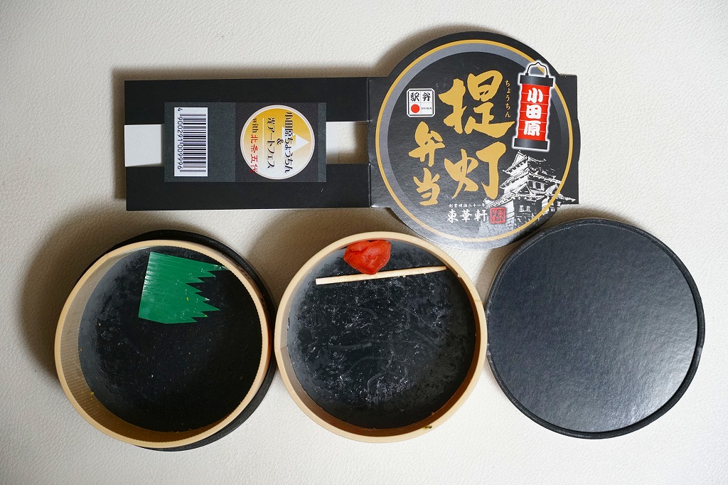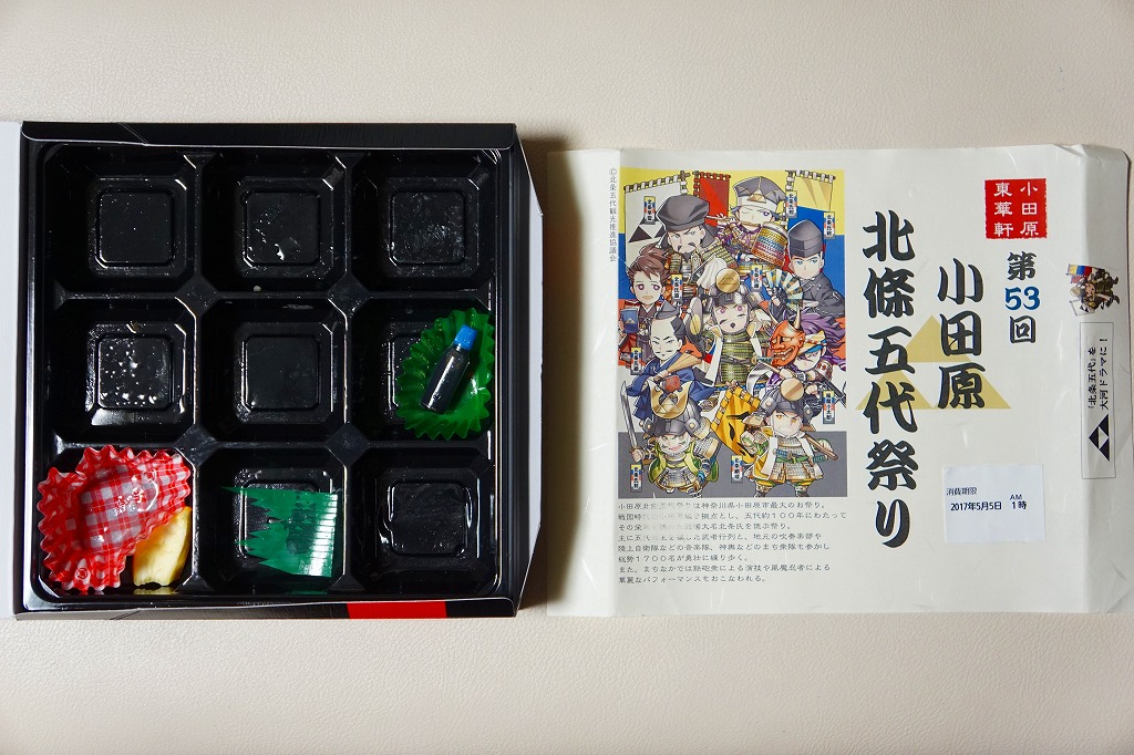 2021(令和3)年5月1日から4日まで小田原駅で販売。ゴールデンウィークと、5月2日から3日までの開催を予定していた第57回小田原北條五代祭りに合わせたものか。その姿はまるで、昭和50年代の小田原駅の名物駅弁「ちょうちん弁当」が復活したように見えた。もとは2020(令和2)年の6月までに、小田急ロマンスカーの車内販売(2021年3月で廃止)で、3日前12時までに予約が必要な弁当として誕生したものらしい。