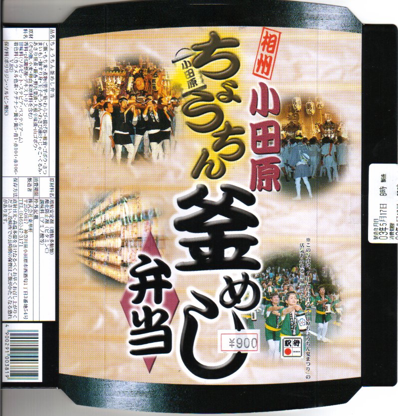 2003(平成15)年2月頃に発売か。「釜めし」を名乗るのに陶製でも釜型でもない長方形の容器を紙箱に収めるが、パッケージのふたの微妙な盛り上がりとデザインが小田原ちょうちんをかたどっているのだとか。1980年代の名物駅弁「ちょうちん弁当」の後継者。