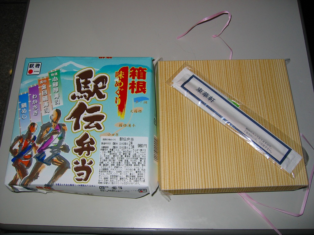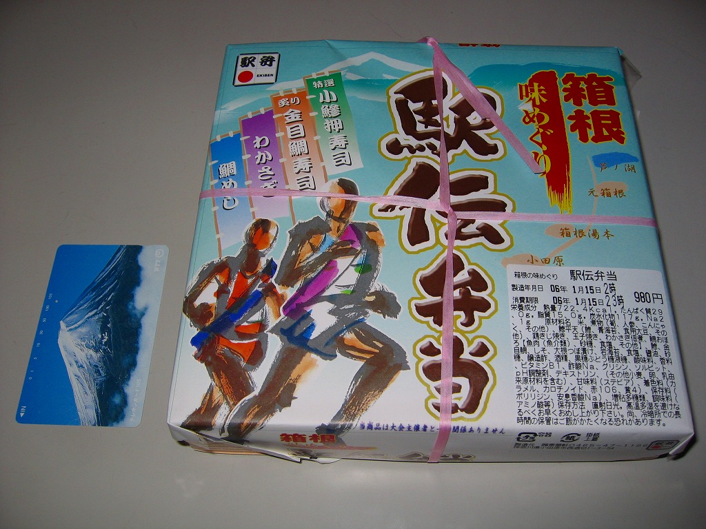 2005(平成17)年10月3日の発売。毎年1月2日と3日に小田原市内を通過する、著名な駅伝大会にあやかったものか。正方形の容器を、弁当名などを書いた大きな掛紙で割りばしごと覆い、紙ひもでしばる。中身はその掛紙にも一部書かれているように、小鯵押寿司2個としそ巻き1個と金目鯛寿司1個に鯛めしという、小田原の名物駅弁のオールスターに、ワカサギや鶏肉や玉子焼や煮物など。