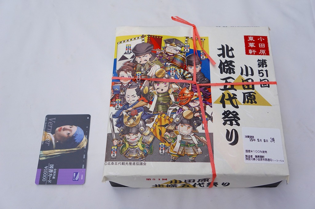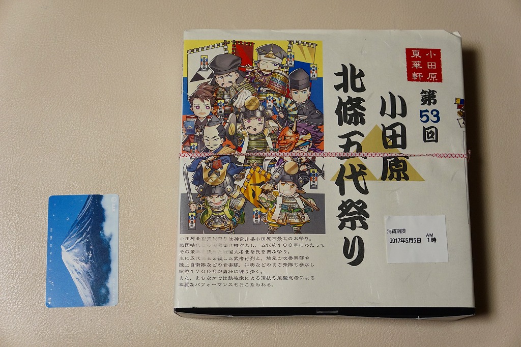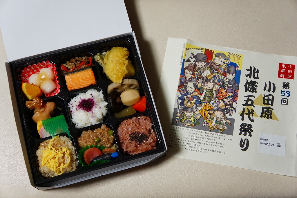 神奈川県小田原市の小田原城の周辺で、毎年5月3日に開催されるお祭り「小田原北條五代祭り」の開催に合わせて、小田原駅でやはり毎年販売される期間限定駅弁。掛紙の絵柄は数年ごとに変わるようで、今回はこの年の4月に小田原市役所から完成が発表された「北条五代PRキャラクター」の集合イラストがそのまま転記されていた。