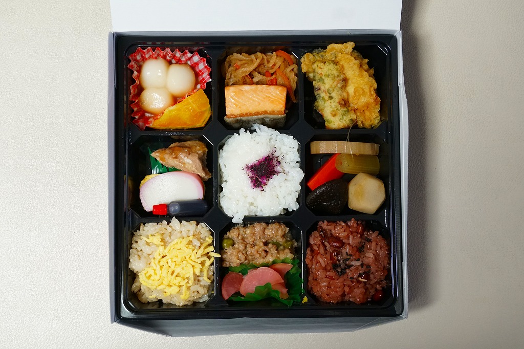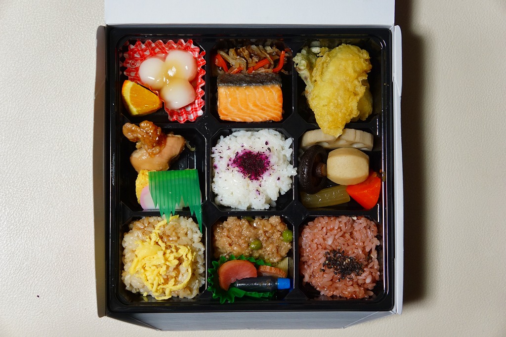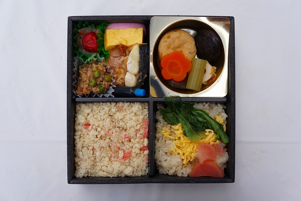掛紙をめくると「会席膳ゆのか」の専用紙箱が出現。中身もそのもので、9区画に白飯(ゆかり)、赤飯(ごま塩)、茶飯(錦糸玉子)、筍鶏そぼろ、漬物、鶏照焼、玉子焼、蒲鉾、煮物、揚物、鮭塩焼、みたらし団子、オレンジを詰める。つまり今回は、既存の駅弁に掛紙をかけて販売した。
