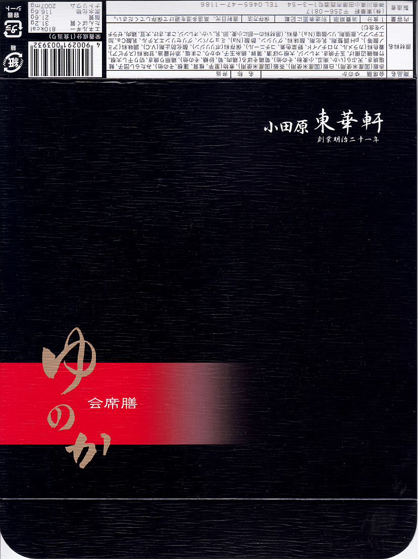 食品表示ラベルに35種類もの食材が記される具だくさん弁当。さすが駅弁屋の弁当で、常温での味が引き立つ。この時期の小田原駅で一週間に17個もの駅弁を購入したが、その中で一番の出来だと感じた。訪問時には小田原駅の橋上自由通路の土産物店で、箱根湯本駅など他の弁当に埋もれる形での販売だった。箱根湯本の土産物店で人気だとか。価格は2004年の購入時で1,000円、2014年4月の消費税率改定で1,030円、2022年時点で1,100円、2023年6月から1,150円、2025年時点で1,200円、おそらく6月から1,300円。